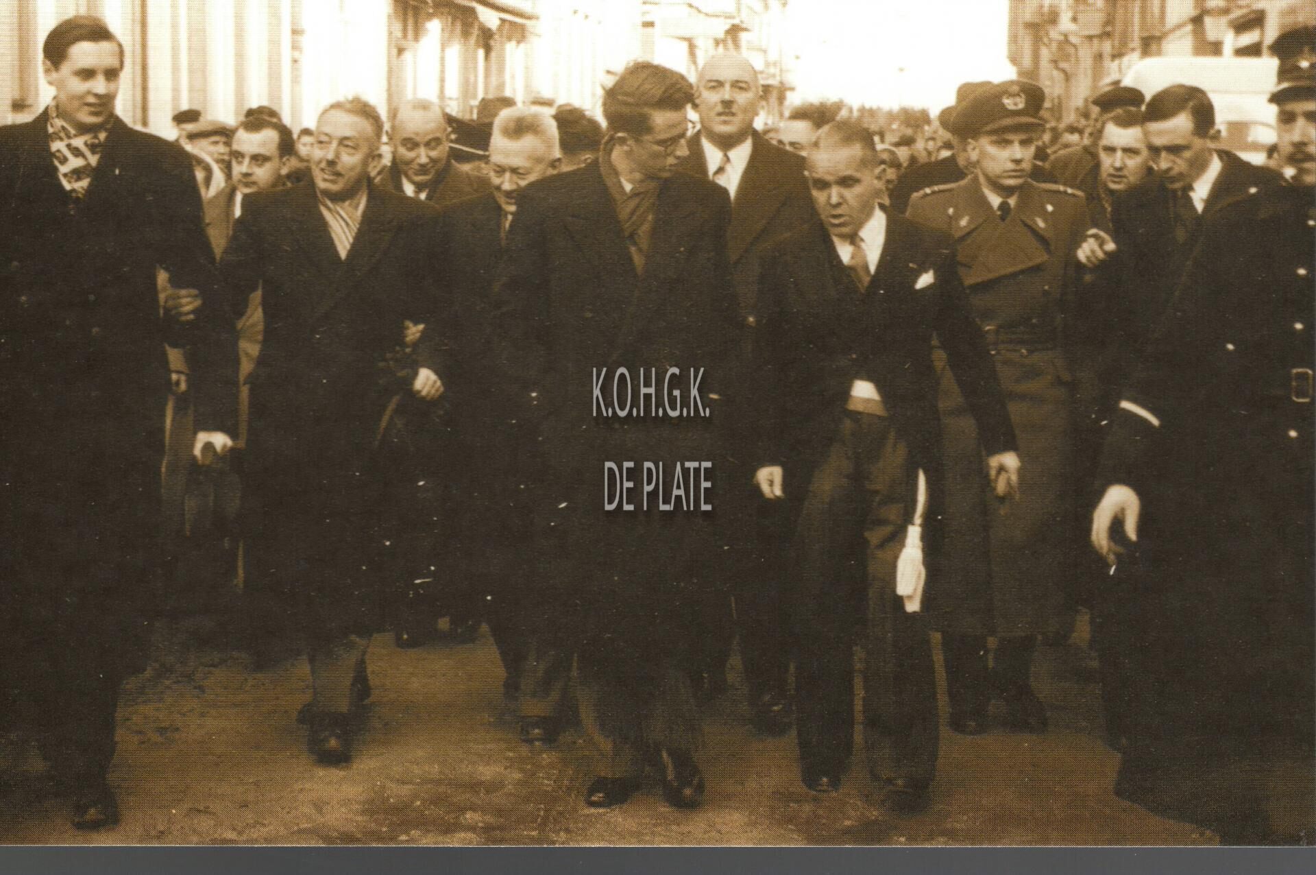 Tropic T 396. - Ostende oender woater 1953. - Koning Boudewijn bezocht onze stad in het gezelschap van het stadsbestuur op 03/02/1953. Koning Boudewijn in gesprek met burgemeester Adolf Van Glabbeke. Tweede van links, Oscar Behogne, minister van Openbare Werken, naast Jan Piers.
