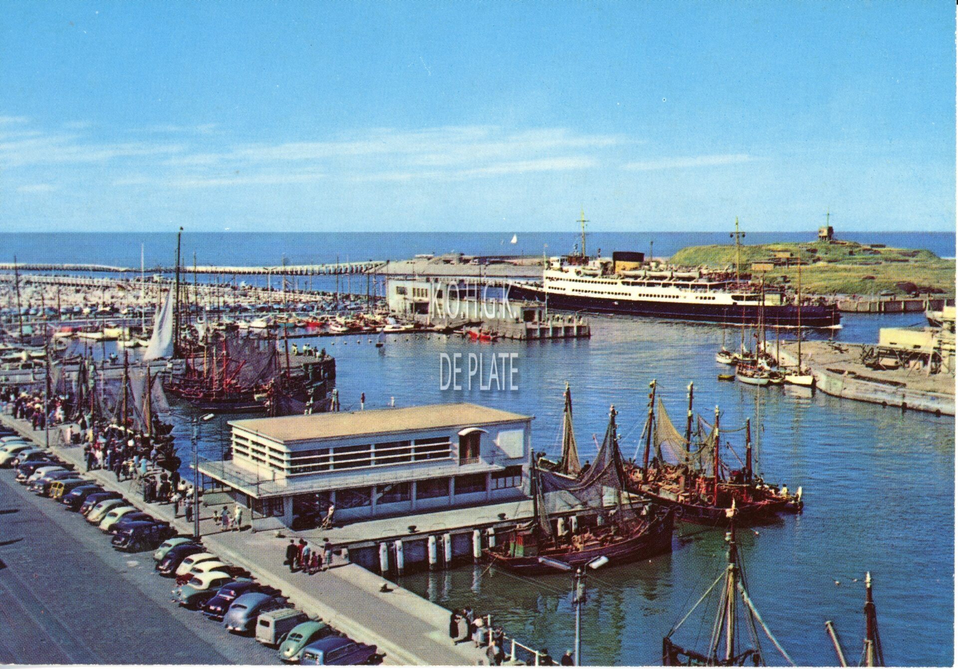 Op de voorgrond, de Visserskaai, de garnaalmijn en het Montgomerydok. Pakketboot Prince Philippe"p in de havengeul van Oostende.