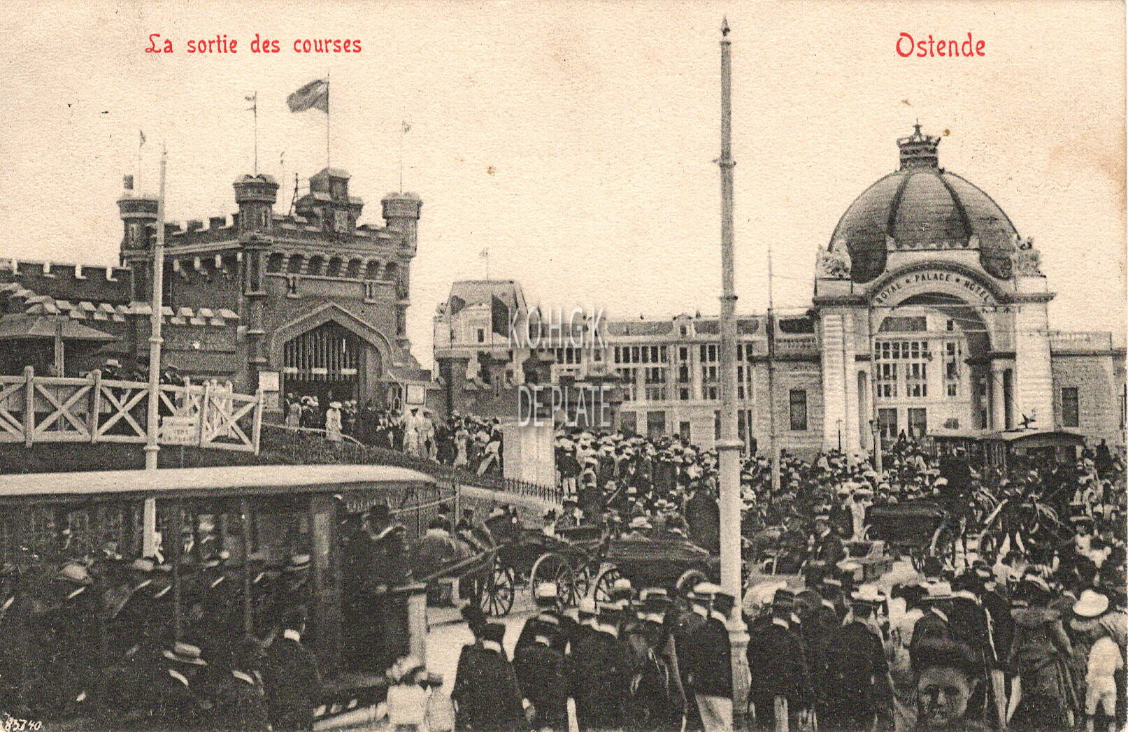 Edit. V.G. [=Victor Grégoire], 42 avenue du midi, Bruxelles. - Ostende - La sortie des courses.- Een drukke namiddag tijdens de paardenrennen. Links, het fort Wellington als ingang van de Wellingtonrenbaan. Men kwam te voet, met paard en koets, een speciale tram werd ingelegd, met de auto. De ingang van de renbaan en het Royal Palace Hotel was gelegen langs de Koersenlaan. Nu de Koningin Astridlaan