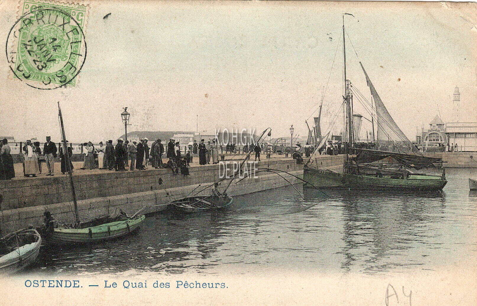 Lagaert, Brux., nr. 1. - Ostende. Quai des Pêcheurs. - Bijgekleurde kaart. - Volk op de kaai van het Schuildok. Aangemeerd het garnaalschipje O.15 "Zoë" van schipper-reder Edouard Verbiest. Op de achtergrond op de oosteroever, de tweede vuurtoren en ervoor het gebouw van de Quarantaine. In dit gebouw werden goederen en brieven, die kwamen uit landen waar eventurele besmettelijke ziekten heersten, gedesinfecteerd.