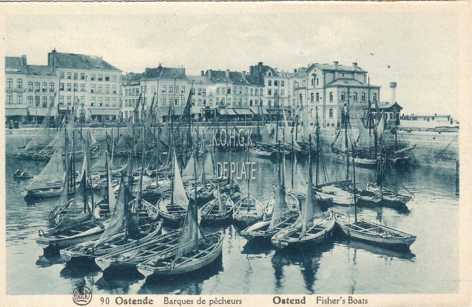 Albert, N° 90. Phototypie, A. Dohmen, Bruxelles. - Ostende - Barques de pêcheurs. Ostend - Fisher's Boats. - Vissersvaartuigen gemeerd in het Schuildok. Vooraan, enkele Oostendse schovers. Rechts, het gebouw van de Bestendige Reddingsdienst. Op de achtergrond, de Visserkaai.