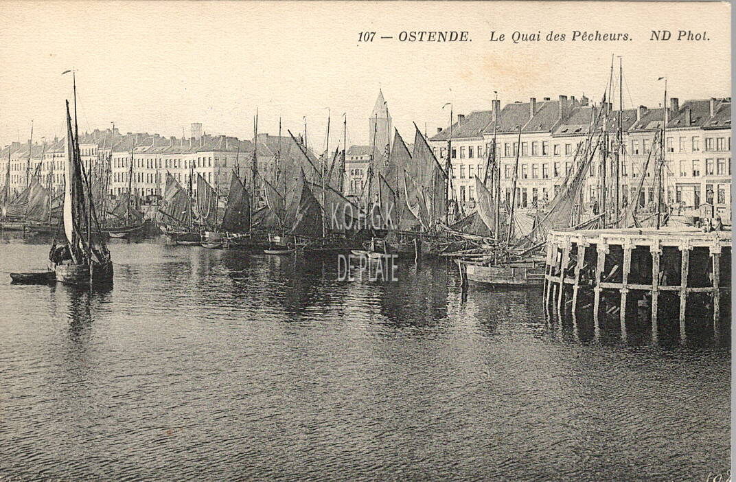 [Neurdein], ND Phot, N° 107. - Ostende - Le Quai des Pêcheurs. - Vissersvaartuigen gemeerd in het Schuildok. Op de achtergrond, de Visserskaai. In het midden, de toren, ook "Peperbusse" genaamd, van de door brand vernielde Sint Pieterskerk.