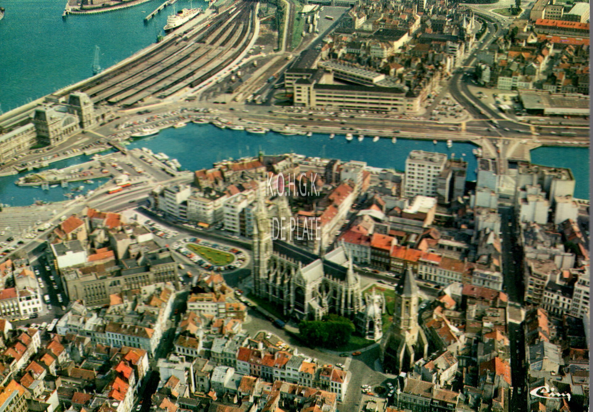 Van Mieghem/AVM O/134. - OOSTENDE - St. Petrus en Pauluskerk en het Station - OSTENDE - Eglise Saints Pierre et Paul et la gare - OSTEND -St-Peter and Paul's Church and the Station - OSTENDE - St-Petrus und Paulus-Kirche und der Bahnhof.