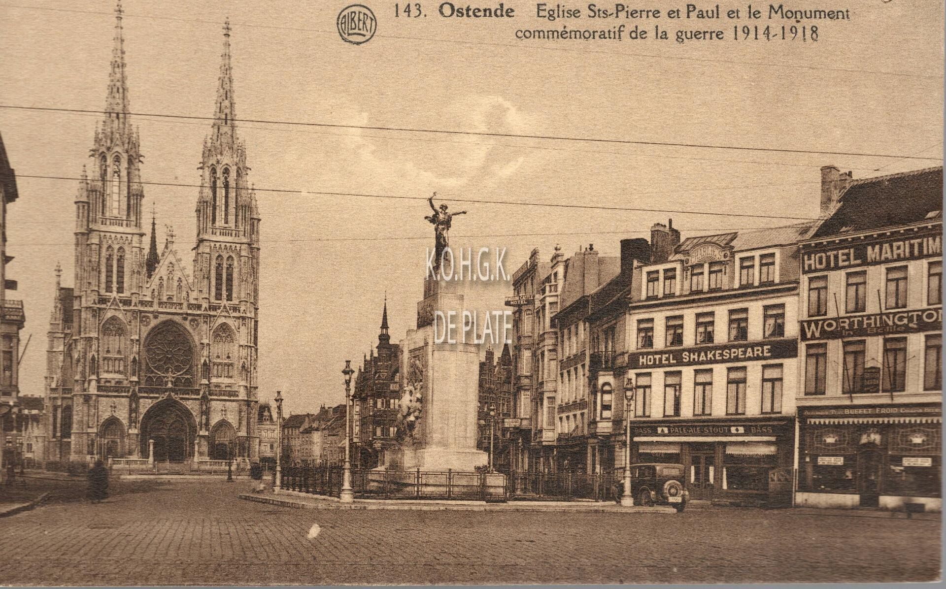 Albert, N° 143. - Ostende - Eglise Sts-Pierre et Paul et le Monument commémoratif de la guerre 1914-1918. - Op de voorgrond het Monument ter nagedachtenis van de Oostendse oorlogsslachtoffers, zowel burgers als militairen uit de Eerste Wereldoorlog. Links, de Sint Petrus-en Pauluskerk. Rechts, Hotel Shakespeare en Hotel Maritime