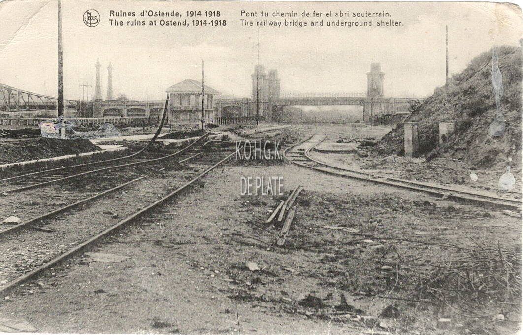 Nels. Edition J. Revyn, 14, rue du Canada, Bruxelles. - Ruines d'Ostende 1914-1918 - Pont du chemin de ver et abri souterrain. The ruins at Ostend 1914-1918 - The railway bridge and underground shelter. - Het Zeestation werd door de Duitsers niet intensief gebruikt. Na de zware schade opgelopen in 1917 werden vele delen van de metaalconstructies gesloopt en afgevoerd als schroot naar de hoogovens de de Duitse staalindustrie. De treinsporen werden, op één spoor na, opgebroken en gebruikt voor de aanleg van nieuwe en het herstel van beschadigde spoorlijnen. Op de achtergrond de Graaf de Smet de Naeyerbruggen. In : Oostende 14-18 : deel 2 / Ferdinand Gevaert en Freddy Hubrechtsen. 1996. p.147-150. Plate bib B229.