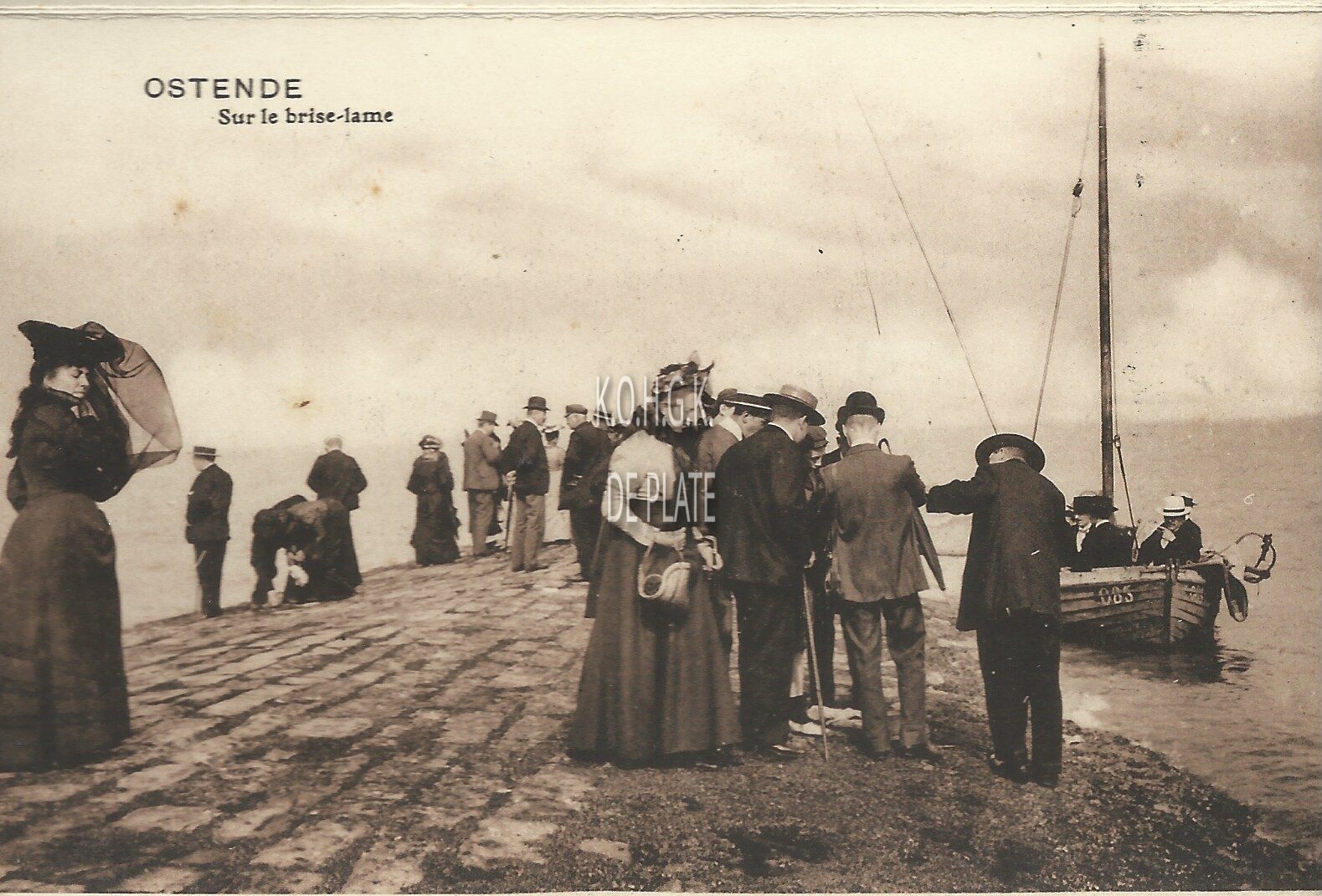Edit. V.G.[Victor Grégoire], 42, Avenue du Midi, Bruxelles. - Ostende - Sur le brise-lame. - Genieten van de zeelucht op de golfbreker. Een vissers verdient wat bij om met toeristen een tochtje te maken in zijn schover O.85. Map 041D/85