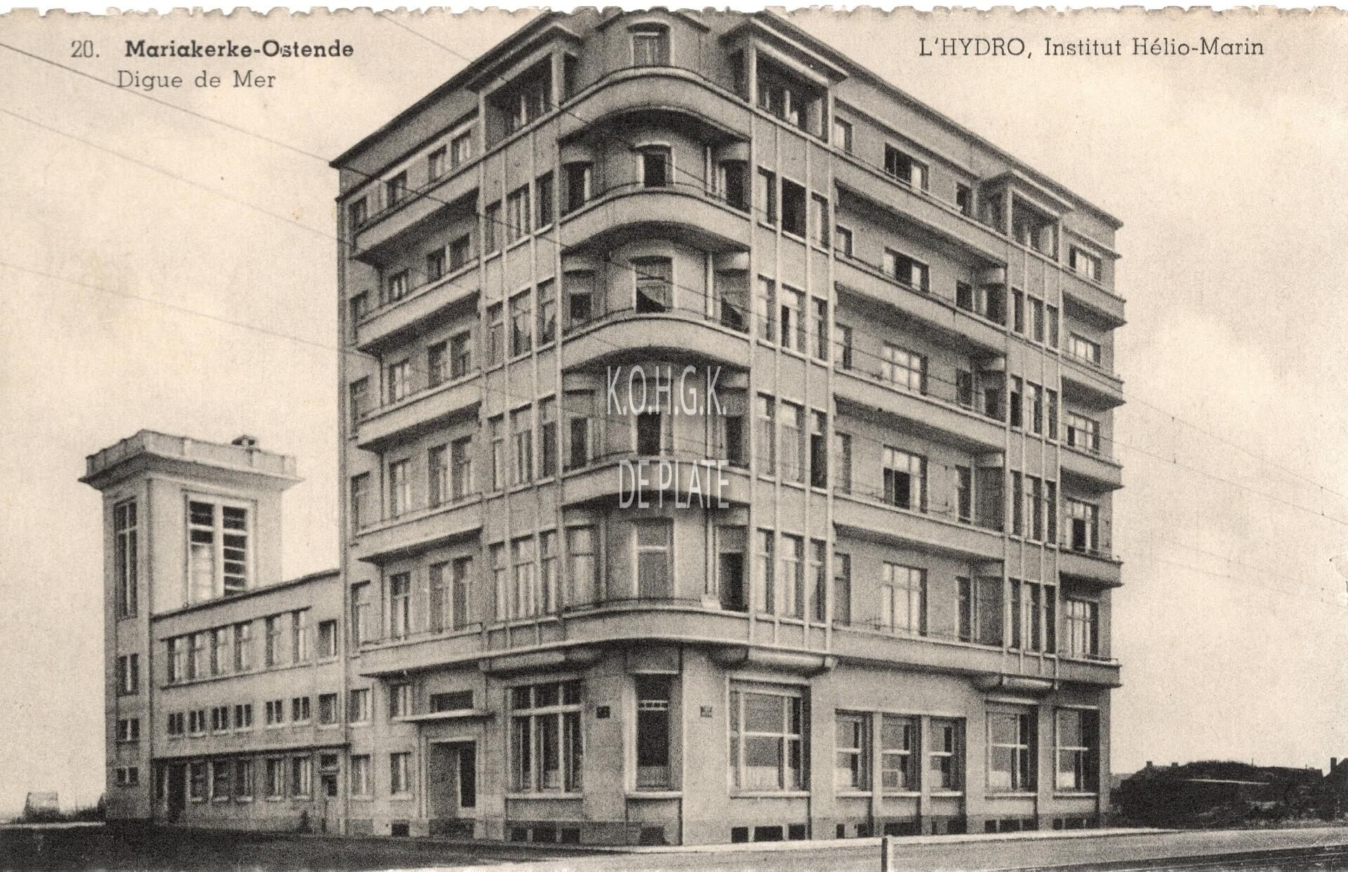Formaat : 9 x 14 cm. - Edition V. Maréchal. 11, avenue des Chardons, Ostende. N°20. - Mariakerke-Ostende - Digue de Mer. L'Hydro, Institut Hélio-Marin. - Gebouwd naar de plannen van architect Antoine Dujardin.