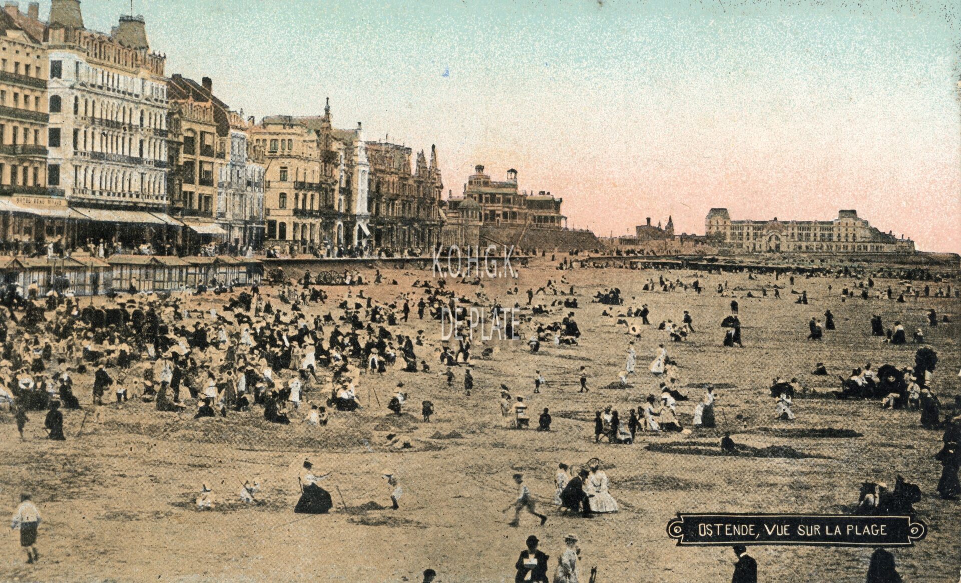Ostende - Vue sur la plage. - Strandrecreatie op het Groot Strand ten Westen van het Kursaal. De Zeedijk met de grote hotels en in het midden, het Koninklijk Chalet. In de achtergrond rechts het Royal Palace Hotel