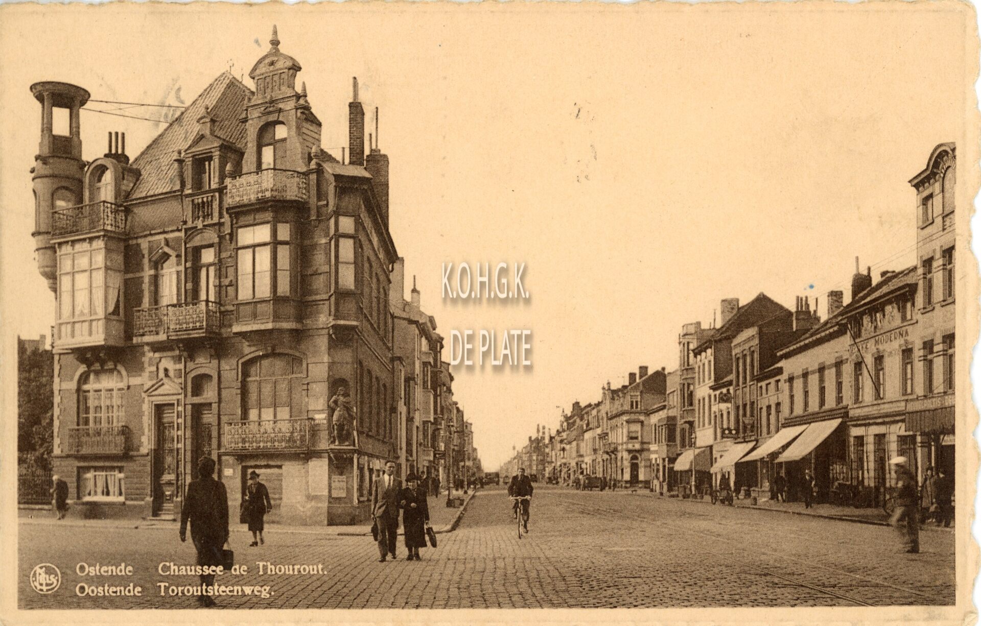 Nels/Thill 6. - Ostende - Chaussee de Thourout. Oostende - Toroutsteenweg. De belle-époque-villa links vormt de hoek Torhoutsesteenweg en Koninginnelaan nabij het kruispunt Petit Paris. De gevel bevat een beeld van de Oostendse kunstenaar Balthasar Mouton en zijn assistent Emile Seynaeve, voorstellende "Karel de Stoute", ("Charles le Téméraire"). Bron : Norbert Hostyn, in : De Plate, 2010, p.236.