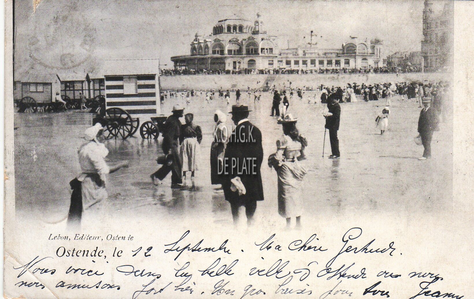 Le Bon, éditeur, Ostende. - Strandrecreatie op het Groot Strand nabij de westelijke gevel van het tweede Kursaal langs de Zeedijk. Vooraan links, personeel van de badendienst. De vrouwen dragen een "kaketuute" (klein wit mutsje)