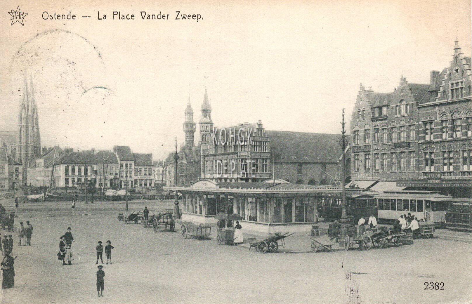 Héliotypie De Graeve, Gand. Star, N° 2382. - Ostende - La Place Vander Zweep. - Het tramwachthuisje op de Vandersweepplaats op de Hazegraswijk. Een tram is aangekomen. Op de achtergrond, de Keizerskaai en de torens van de Sint Petrus en Pauluskerk.