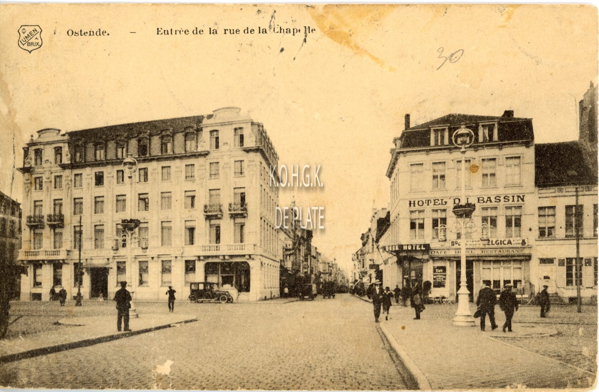 Lumen/G. Le Roy. -Entrée de la Rue de la Chapelle. Hotel du Bassin, nr. 15, had 14 kamers met lopend water, centrale verwarming en 1 badkamer en was het ganse jaar open.