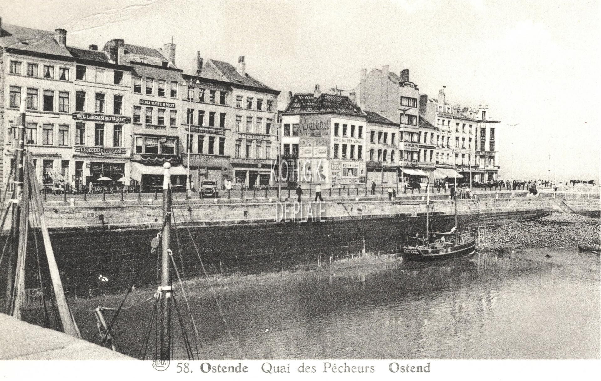 Formaat : 9 x 14 cm. - Albert N°58. - De Visserskaai kort na de Tweede Wereldoorlog. Het hotel-restaurant "La Becasse" en rechts het restaurant "Belgica". Op de hoek van de Cirkelstraat, café "Rubens". Het verwaarloosde Schuildok.