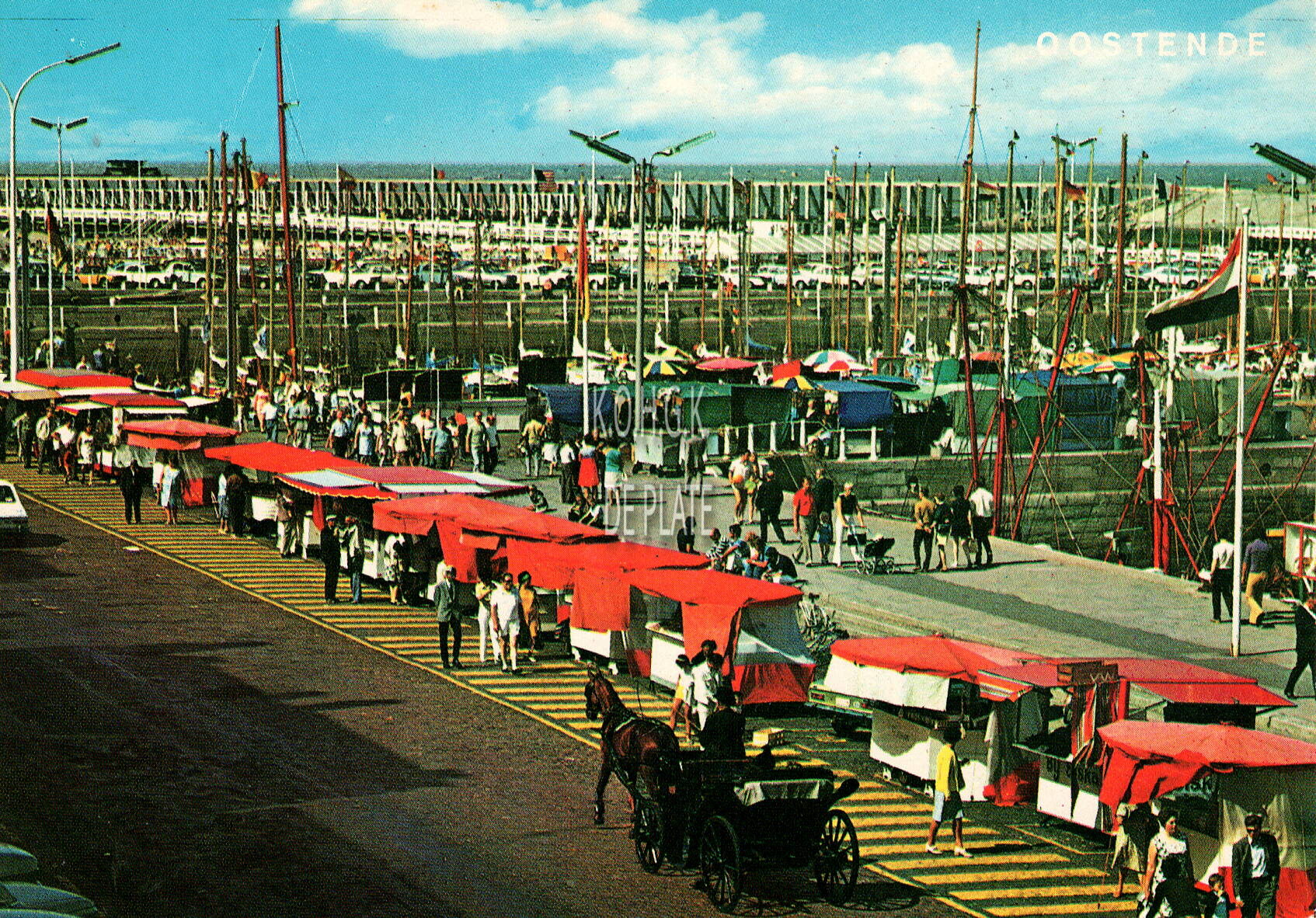 Van Mieghem A., N° 72. - Oostende - Visverkoop aan de kaai. Vente de poisson au quai. Fishmarket on the Quay. Fischverkauf am Kai. - Verkoop van vis door de ambulante kraampjes langs de Visserskaai en ook aan de vistrap (rechts). In het zomerseizoen kan men een ritje door de stad maken met paard en koets