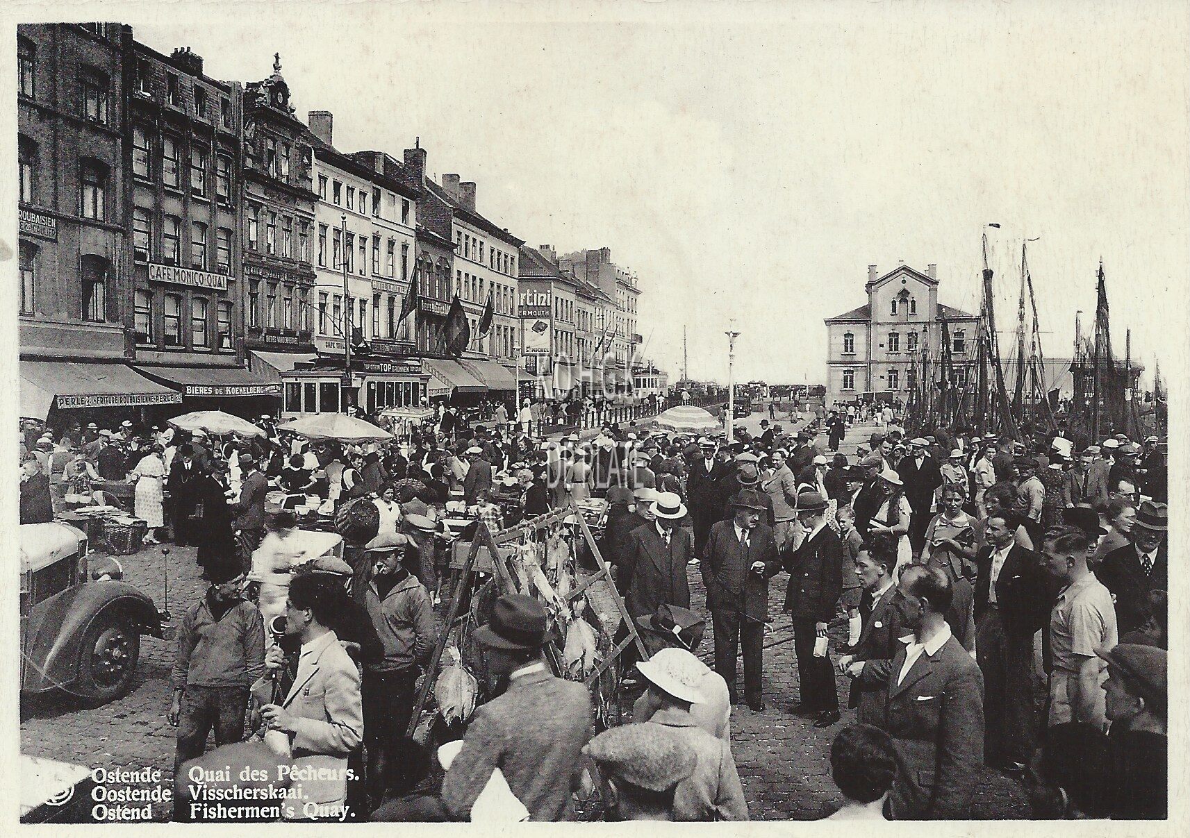 Formaat : 10,5 x 15 cm. - Nels "Bromurite". - Ostende - Quai des Pêcheurs. Oostende - Visscherskaai. Ostend - Fishermen's Quay. - Vishandel op de Visserskaai nabij de vistrap. Een rek met droogvis. Op het einde, het gebouw van de bestendige reddingsdienst. Twee stadstrams. Links "Café Monico Quai".