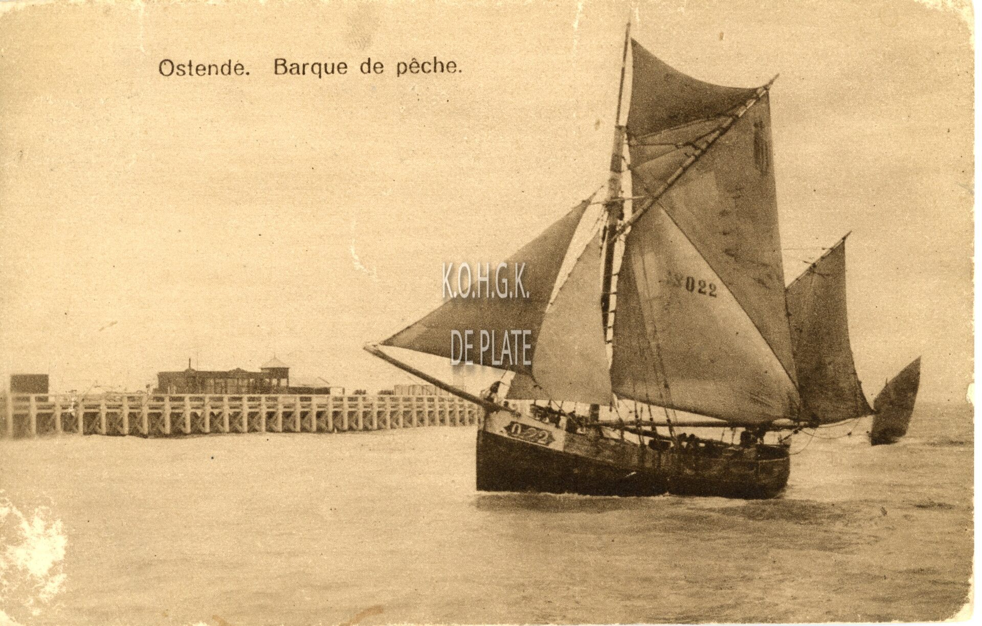 De Oostendse tweemastsloep O.22 Romanie vaart de haven van Oostende binnen. In de achtergrond het Weststaketsel en het café-paviljoen.