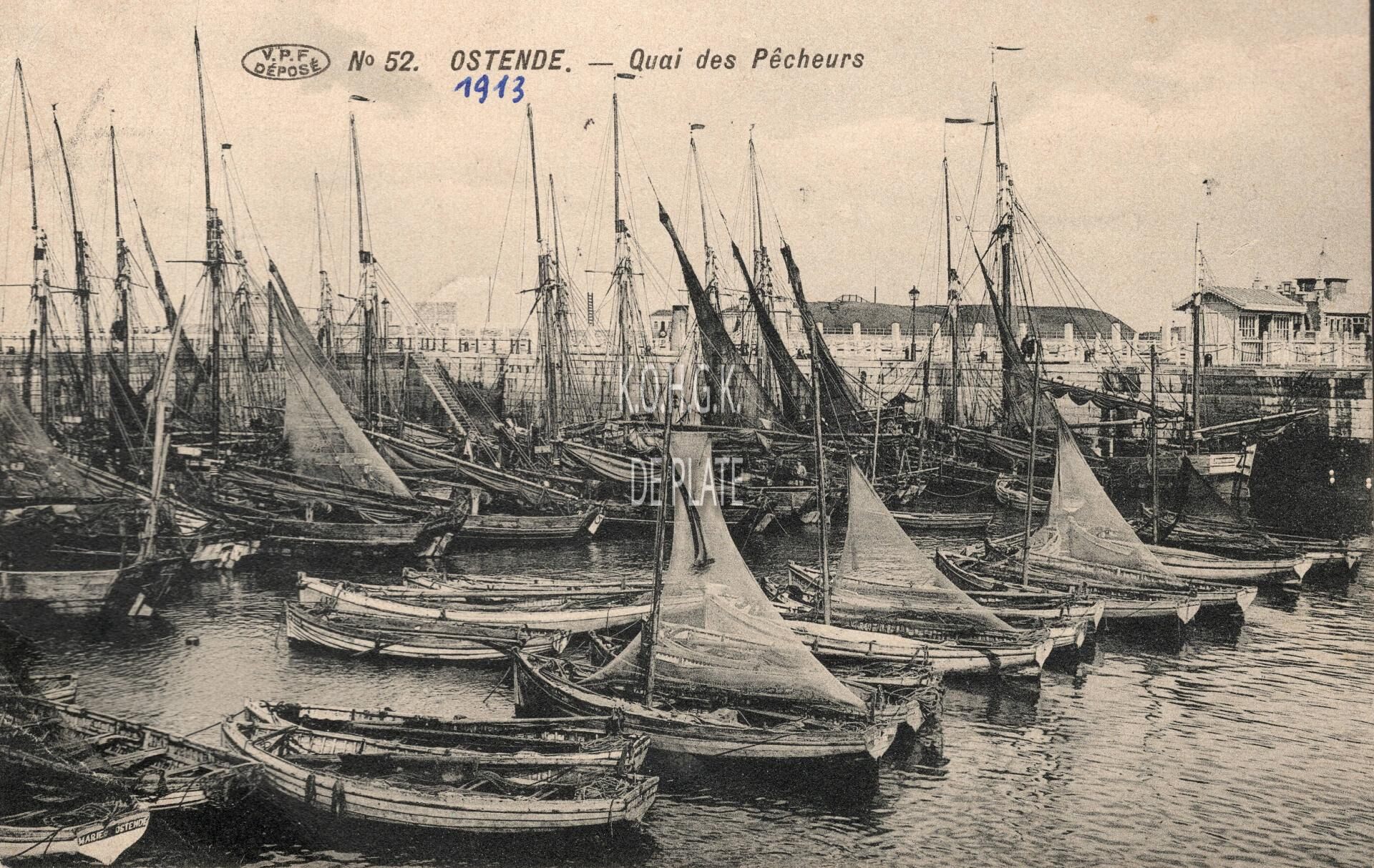 V.P.F., N° 52. Phototypie Préaux Frères, Ghlin. - Ostende - Quai des Pêcheurs. - Oostendse schovers gemeerd in het Schuildok. Op de achtergrond, de Oosteroever met het militaire bouwwerk "De Halve Maan"