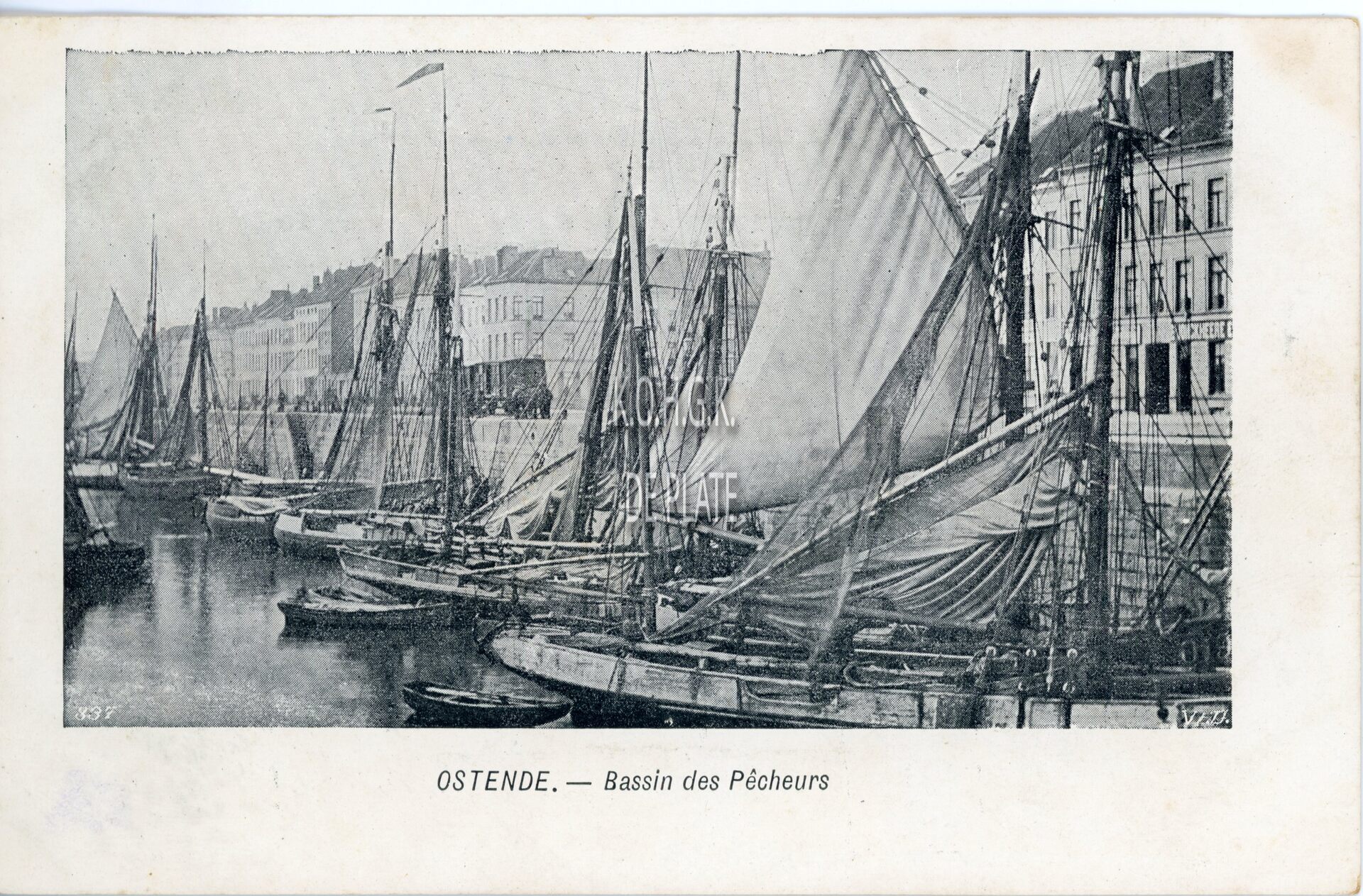VED/Doncq 337. - Ostende. - Bassin des Pêcheurs. Vissersvaartuigen aangemeerd in het Schuildok, nu Montgomerydok. Op de Visserskaai, goederenwagons voor het transport van vis vanuit de oude vismijn,