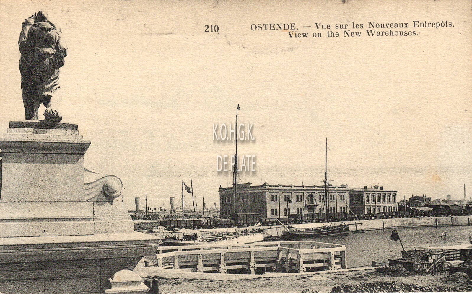 Neurdein Frères, Imp. Succ. Paris-Corbeil, N°210. - Ostende - Vue sur les Nouveaux Entrepôts. View on the New Warehouses. - Het Vlotdok en de nieuwe stedelijke opslagplaatsen. Detail van de leeuw die de brug versierde over de Demeysluis. Kaart verzonden in 1949, maar de bronzen leeuwen werden reeds door de Duitse bezetter tijdens de Eerste Weredloorlog weggenomen.