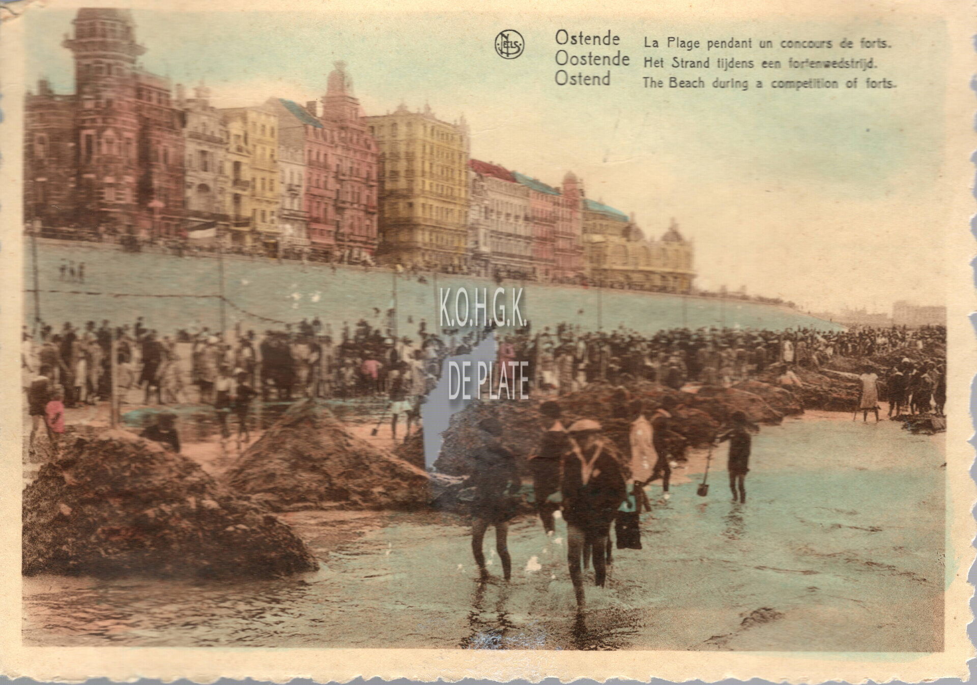 Nels. - OSTENDE La Plage pendant un concours de forts - OOSTENDE Het Strand tijdens een fortenwedstrijd - OSTEND The Beach during a competition of forts. - Bijgekleurde kaart