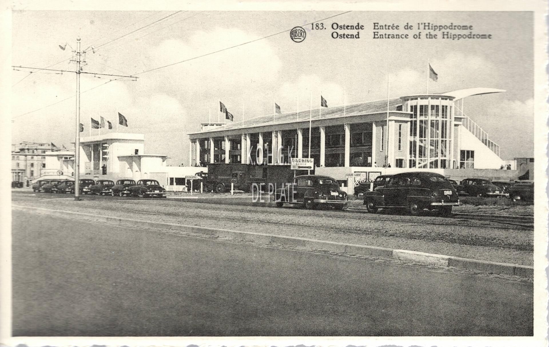Formaat : 9 x 14 cm. - Albert, N°183. Phototypie A. Dohmen, Bruxelles. - Ostende - Entrée de l'Hippodrome. Ostend - Entrance of the Hippodrome. - De ingang en tribune aan de Koningin Astridlaan.