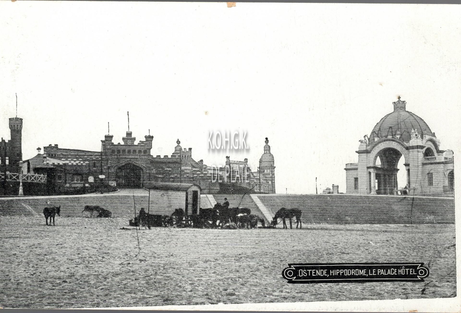 Formaat : 9 x 14 cm. - Ostende, Hippodrome, le Palace Hôtel. De ingang van de Wellingtonrenbaan en rechts de ingang van het "Royal Palace Hôtel". Op de voorgrond strandrecreatie met een ritje op een ezel of paard