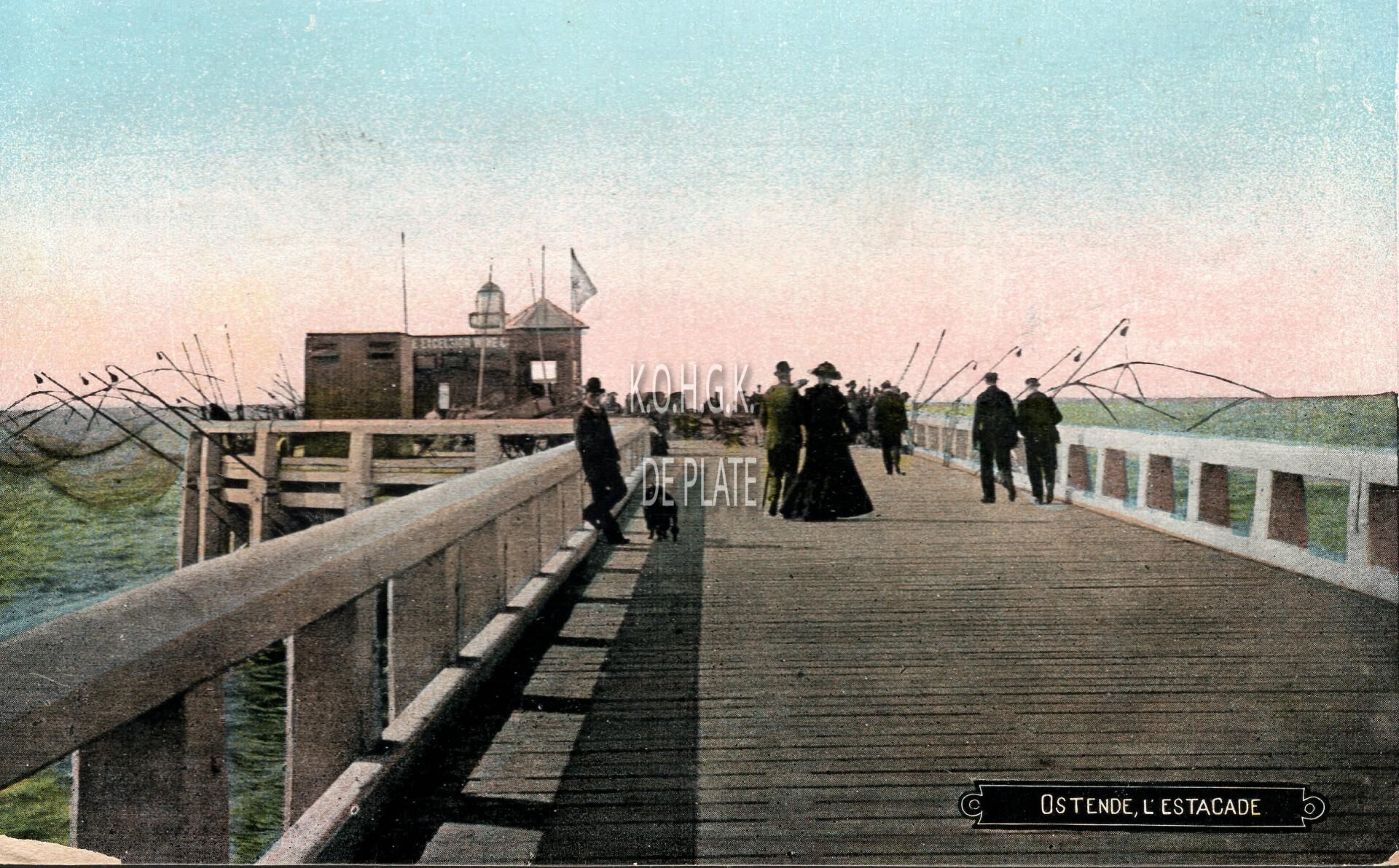 Ostende - L'Estacade. - Bijgekleurde kaart. - Een zonnige namiddag in de Belle Epoque. Het einde van het Weststaketsel, waar je op het terras van het café-paviljoen kon genieten van de gezonde zeelucht. Je kon met een kruisnet proberen een krabbetje of visje te vangen.