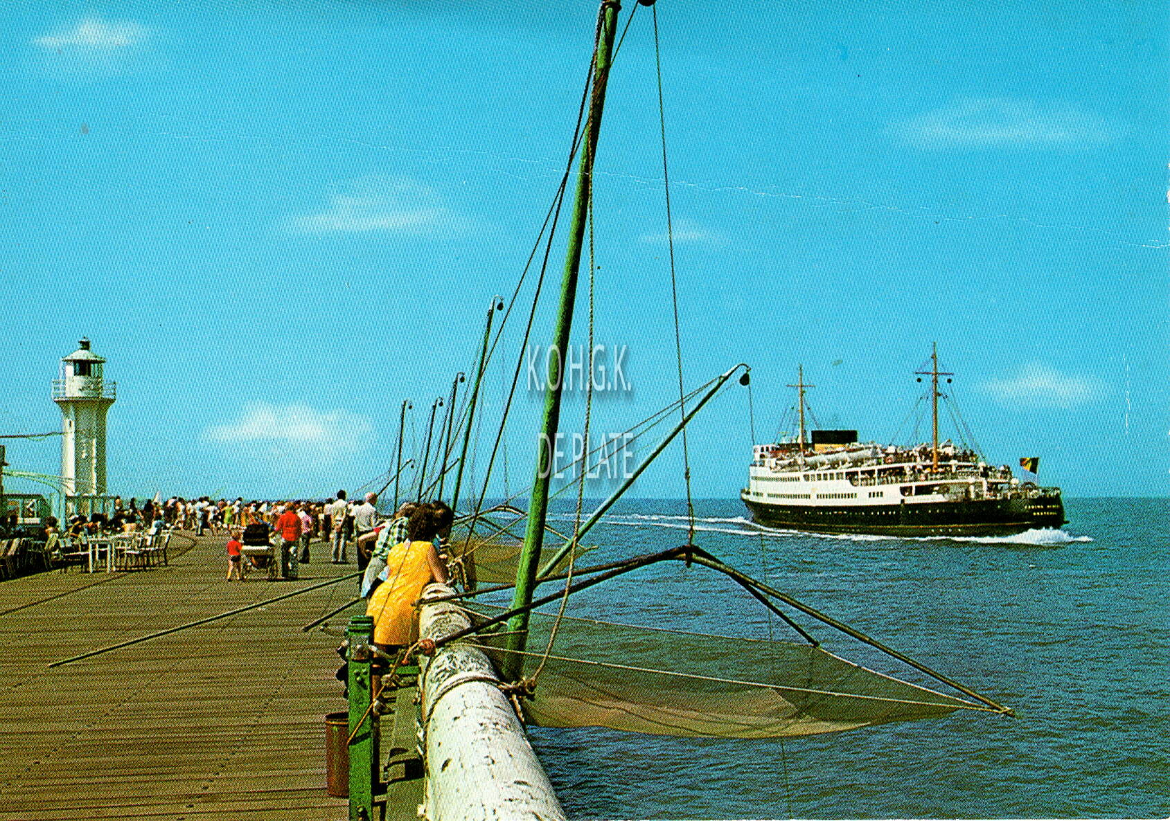Van Mieghem A. Oostende, N°96. - Oostende - Staketsel. Estacade. Palissade. Staket. - Het einde van het Westataketsel, of "'t koptje van 't hoofd". Je kon er een kruisnet huren en proberen een krabbetje of visje te vangen. Links, was het "cafépaviljoen", waar je kon genieten van een drankje en de gezonde zeelucht. Achteren, het ijjzeren torentje met mistbel. Een pakketboot van de Oostende Dover lijn vaart de havengeul binnen.