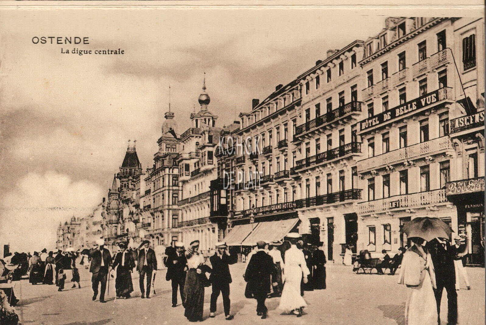 Edit. V.G.[Victor Grégoire], 42, Avenue du Midi, Bruxelles. - Ostende - La digue centrale. - De Zeedijk vanaf Kursaal-Oosthelling. Rechts "Hôtel de Belle Vue".