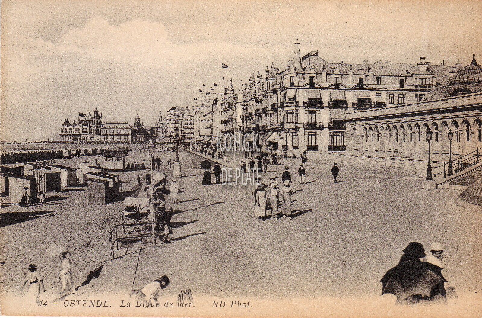 [Neurdein], ND Phot., N° 14. - Ostende - La Digue de mer. - De Zeedijk, met rechts, de Venetiaanse Gaanderijen. De hoek met de Parijsstraat tot aan de westgevel van het derde Kursaal. Links, het Groot Strand met de strandcabines en wat verder de badkarren. Een vrouw met kinderwagen, nabij de trappen, geniet van een zonnige dag