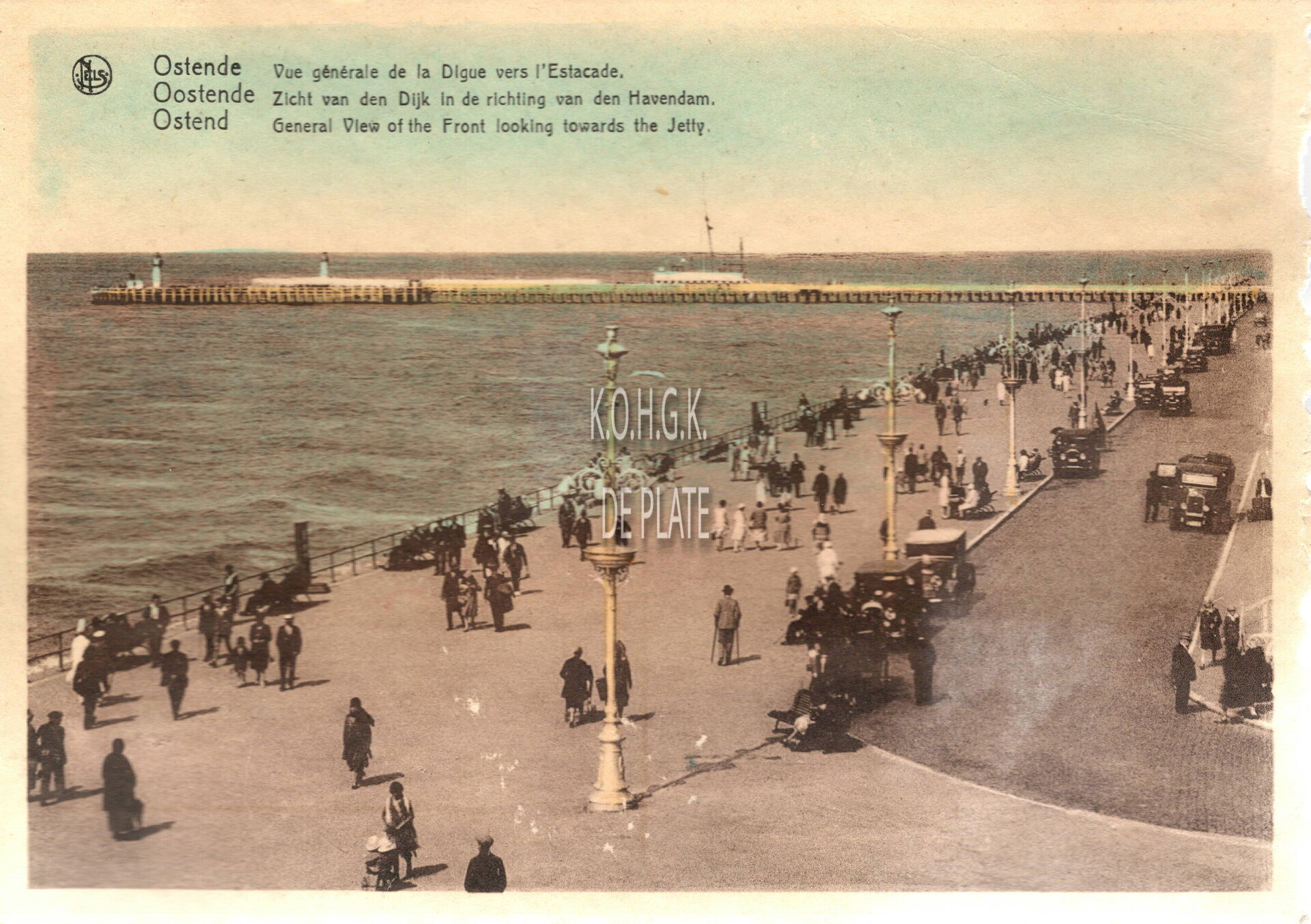 Nels. - OSTENDE Vue générale de la Digue vers l'Estacade - Oostende Zicht van den Dijk in de richting van den Havendam - OSTEND General View of the Front looking towards the Jetty. - Bijgekleurde kaart