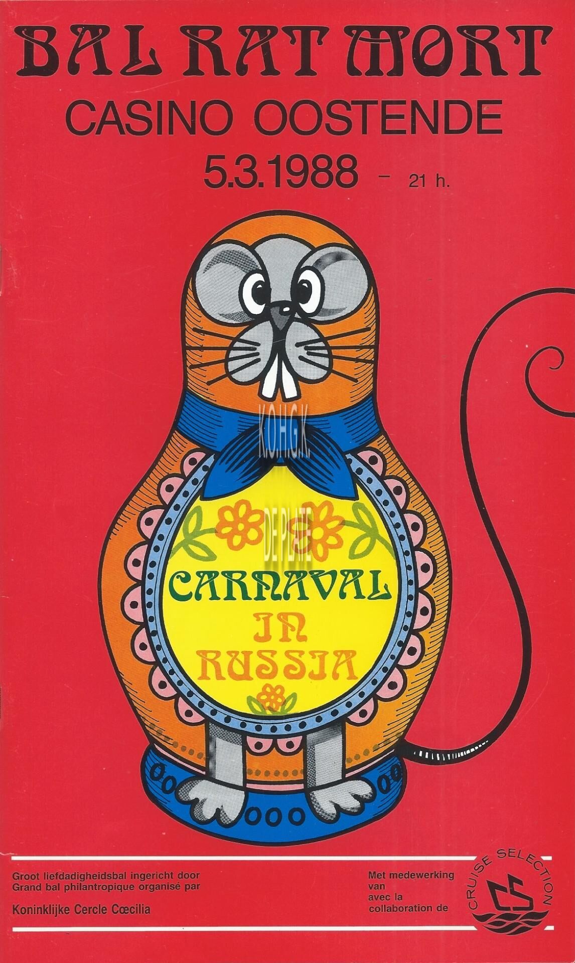 Omschrijving 91e bal ingericht door de Koninklijke Cercle Coecilia met de medewerking van Cruise Selection Trefwoorden CASINO-KURSAAL ; PROGRAMMA'S CASINO-KURSAAL ; BALS BAL DU RAT MORT CARNAVAL IN RUSSIA (BAL DU RAT MORT) KONINKLIJKE CERCLE COECILIA (SOCIO-CULTURELE VERENIGING) CARNAVAL FOLKLORE Plaatskenmerk ARCHIEF 110 ARCHIEFDOOS CARNAVAL Inventarisnummers 2023/0331 05/ 03/ 1988 Collectie Archief De Plate Print