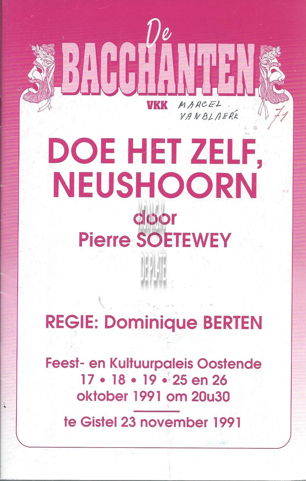 Omschrijving door Pierre Soetewey. Regie : Dominique Berten Trefwoorden PROGRAMMA'S DE BACCHANTEN (TONEELVERENIGING) DOE HET ZELF NEUSHOORN (TONEELSTUK) TONEELSTUKKEN SOETEWEY PIERRE (AUTEUR) BERTEN DOMINIQUE (TONEELREGISSEUR) FEEST- EN CULTUURPALEIS ; TONEEL Plaatskenmerk ARCHIEF 110 ARCHIEFDOOS KUNSTEN Inventarisnummers 2021/2262 17/ 10/ 1991 26/ 10/ 1991 Herkomst VANBLAERE MARCEL Vervaardiger Grafisch Bedrijf Lammaing Bestanden 2021-2262.pdf Print