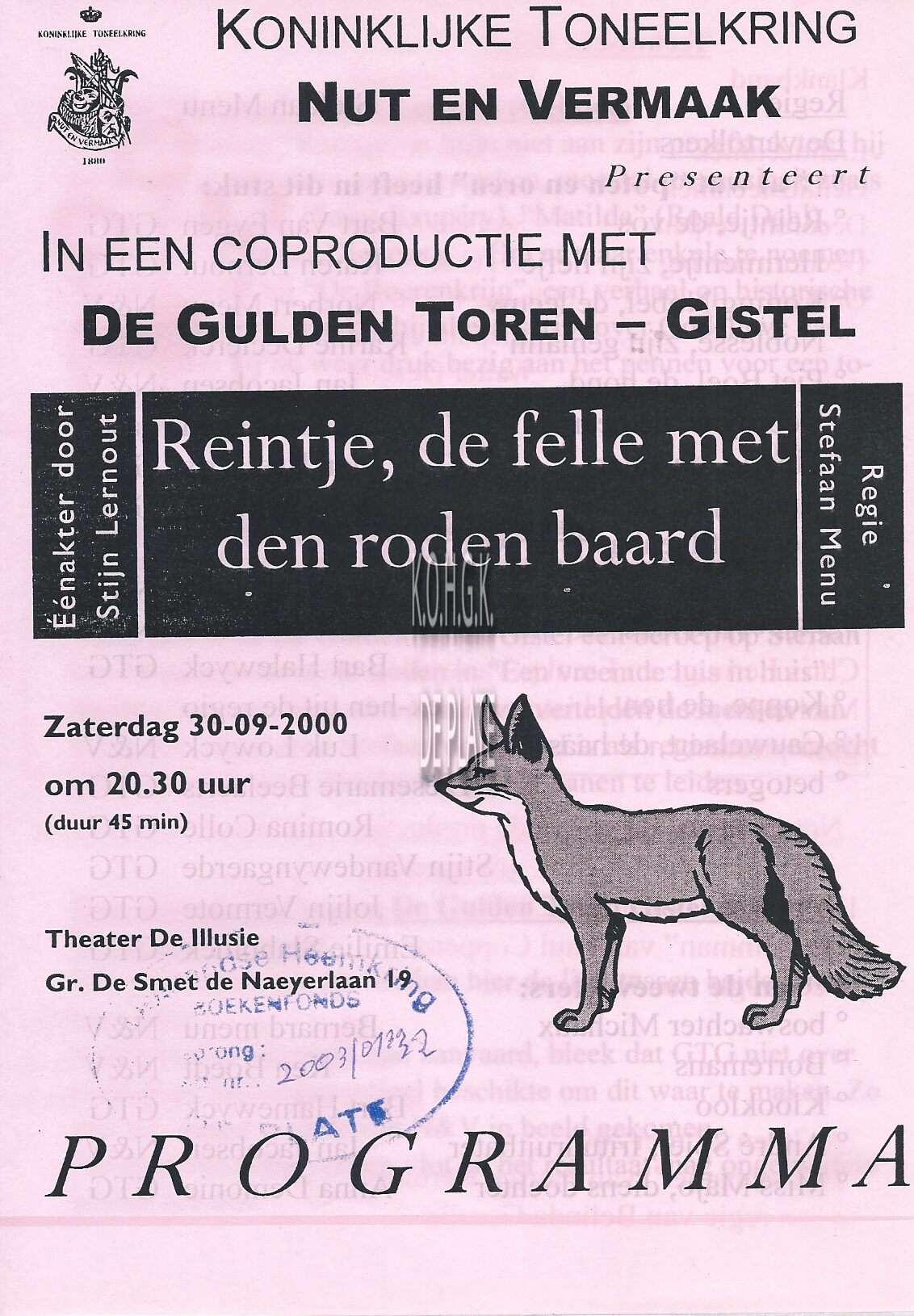Programma : Koninklijke toneelkring Nut en Vermaak in coproductie met de Gulden Toren - Gistel. Reintje, de felle met den roden baard. De Illusie. 30/09/2000