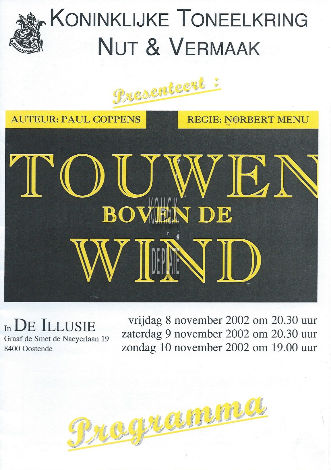 Omschrijving Auteur : Paul Coppens. Met beknopte bio- en bibliografie van de auteur. Regie : Norbert Menu Trefwoorden DE ILLUSIE (CAFE THEATERZAAL) NUT EN VERMAAK (TONEELVERENIGING) PROGRAMMA'S TOUWEN BOVEN DE WIND (TONEELSTUK) TONEELSTUKKEN COPPENS PAUL (AUTEUR) MENU NORBERT (1959-2006) (TONEELSPELER REGISSEUR) Plaatskenmerk ARCHIEF 110 ARCHIEFDOOS KUNSTEN Inventarisnummers 2003/0138 11/ 2002 10/ 11/ 2002 Herkomst JACOBSEN VANTHUYNE JEAN Bestanden 2003-0138.pdf Print