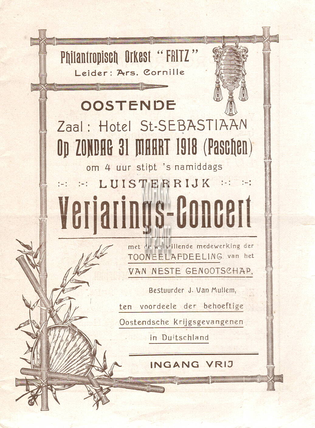 Op zondag 31 maart 1918 (Pasen) in Hotel St.-Sebastiaan ten voordele van de behoeftige Oostendse krijgsgevangenen in Duitsland met de welwillende medewerking van de toneelafdeling van het Van Neste Genootschap en het Philantropisch orkest Fritz