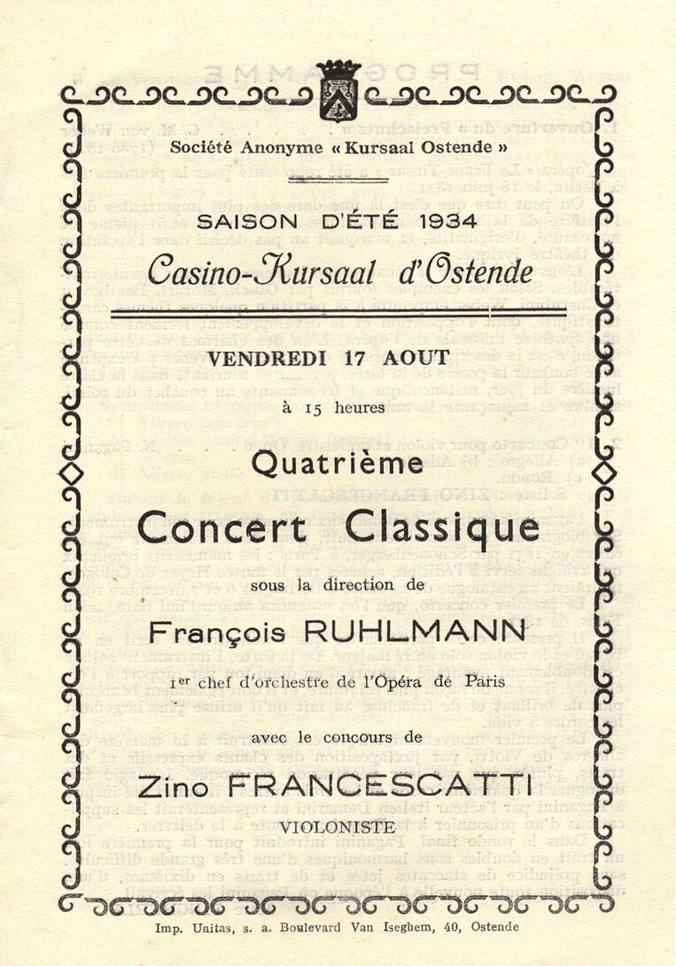 sous la direction de François Ruhlmann, 1er chef d'orchestre de l'Opéra de Paris, avec le concours de Zino Francescatti, violoniste. Het volledig programma is onderaan leesbaar in pdf. - Map 015 C-04a en b