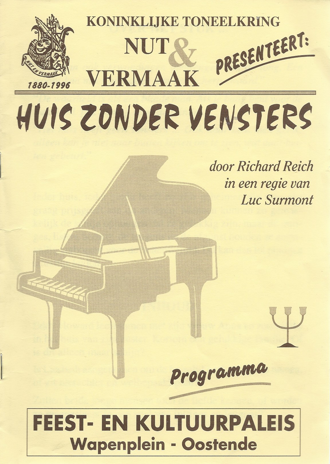 Omschrijving door Richard Reich in een regie van Luc Surmont Trefwoorden PROGRAMMA'S NUT EN VERMAAK (TONEELVERENIGING) HUIS ZONDER VENSTERS (TONEELSTUK) TONEELSTUKKEN REICH RICHARD (AUTEUR) SURMONT LUC (TONEELREGISSEUR) FEEST- EN CULTUURPALEIS ; TONEEL Plaatskenmerk ARCHIEF 110 ARCHIEFDOOS KUNSTEN Inventarisnummers 2021/2226 10/ 05/ 1996 12/ 05/ 1996 Herkomst JACOBSEN VANTHUYNE JEAN Bestanden 2021-2226.pdf Print