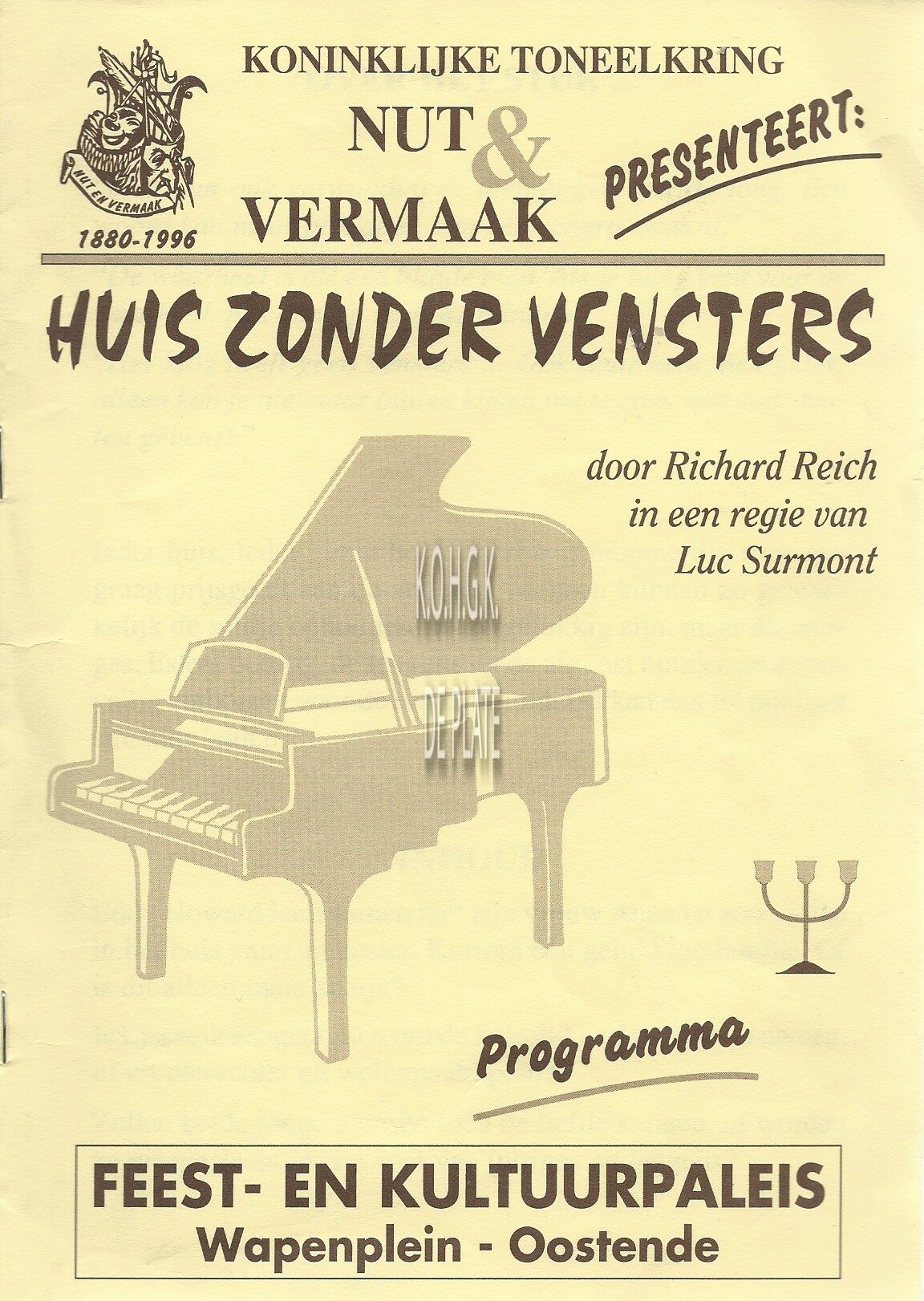 Omschrijving door Richard Reich in een regie van Luc Surmont Trefwoorden PROGRAMMA'S NUT EN VERMAAK (TONEELVERENIGING) HUIS ZONDER VENSTERS (TONEELSTUK) TONEELSTUKKEN REICH RICHARD (AUTEUR) SURMONT LUC (TONEELREGISSEUR) FEEST- EN CULTUURPALEIS ; TONEEL Plaatskenmerk ARCHIEF 110 ARCHIEFDOOS KUNSTEN Inventarisnummers 2021/2226 10/ 05/ 1996 12/ 05/ 1996 Herkomst JACOBSEN VANTHUYNE JEAN Bestanden 2021-2226.pdf Print