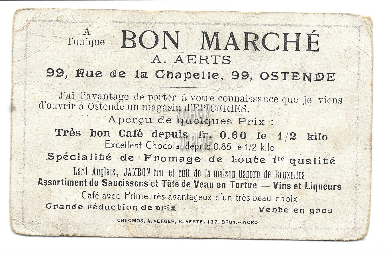 J'ai l'avantage de porter à votre connaissance que je viens d'ouvrir à Ostende un magasin d'Epiceries. A perçu de qualques Prix : Très bon Café depuis fr. 0.60 le 1/2 kilo. Excellent Chocolat depuis 0.85 le 1/2 kilo. Spécialité de Fromage de toute 1re qualité. Lard Anglais, Jambon crue et cuit de la la maison Osborn de Bruxelles. Assortiment de Saucissons et Tête de Veau en Tortue - Vins et Liqueurs. Café avec Prime très avantageux d'un très beau choix. Grande réduction de prix. Vente en gros. - Map Recl 34