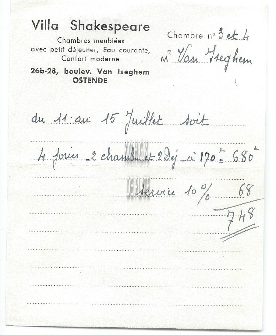 Omschrijving Verhuring gemeubelde kamers met ontbijt. Lopend water. Modern comfort Trefwoorden HANDEL ; REKENINGEN VILLA SHAKESPEARE VAN ISEGHEMLAAN Plaatskenmerk ARCHIEF 110 ARCHIEFDOOS HANDEL Inventarisnummers 2014/2318 Print