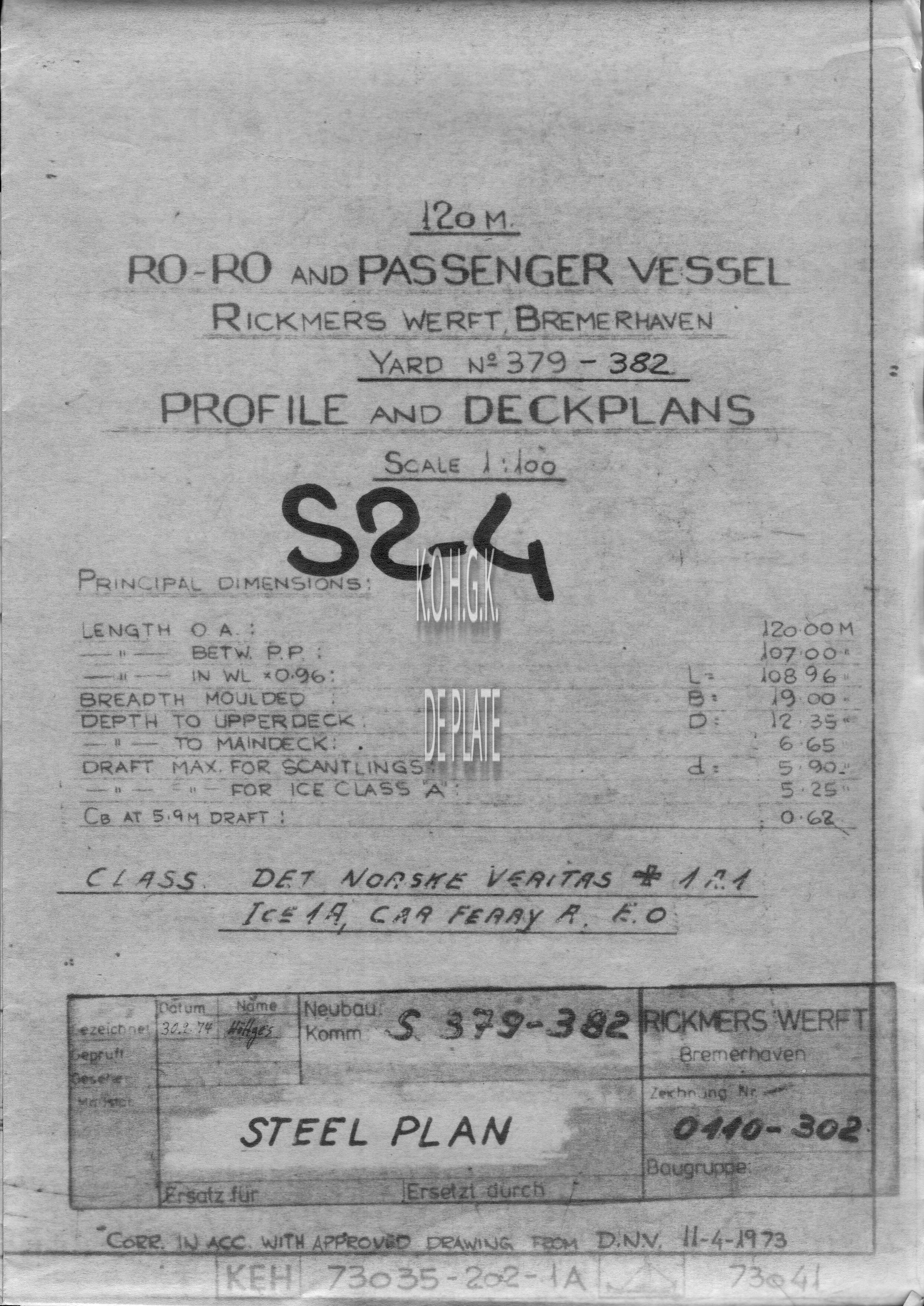 Plan Ro-Ro and passenger vessel Rickmers werft Bremerhaven Profile and deckplan. (later Reine Astrid).
