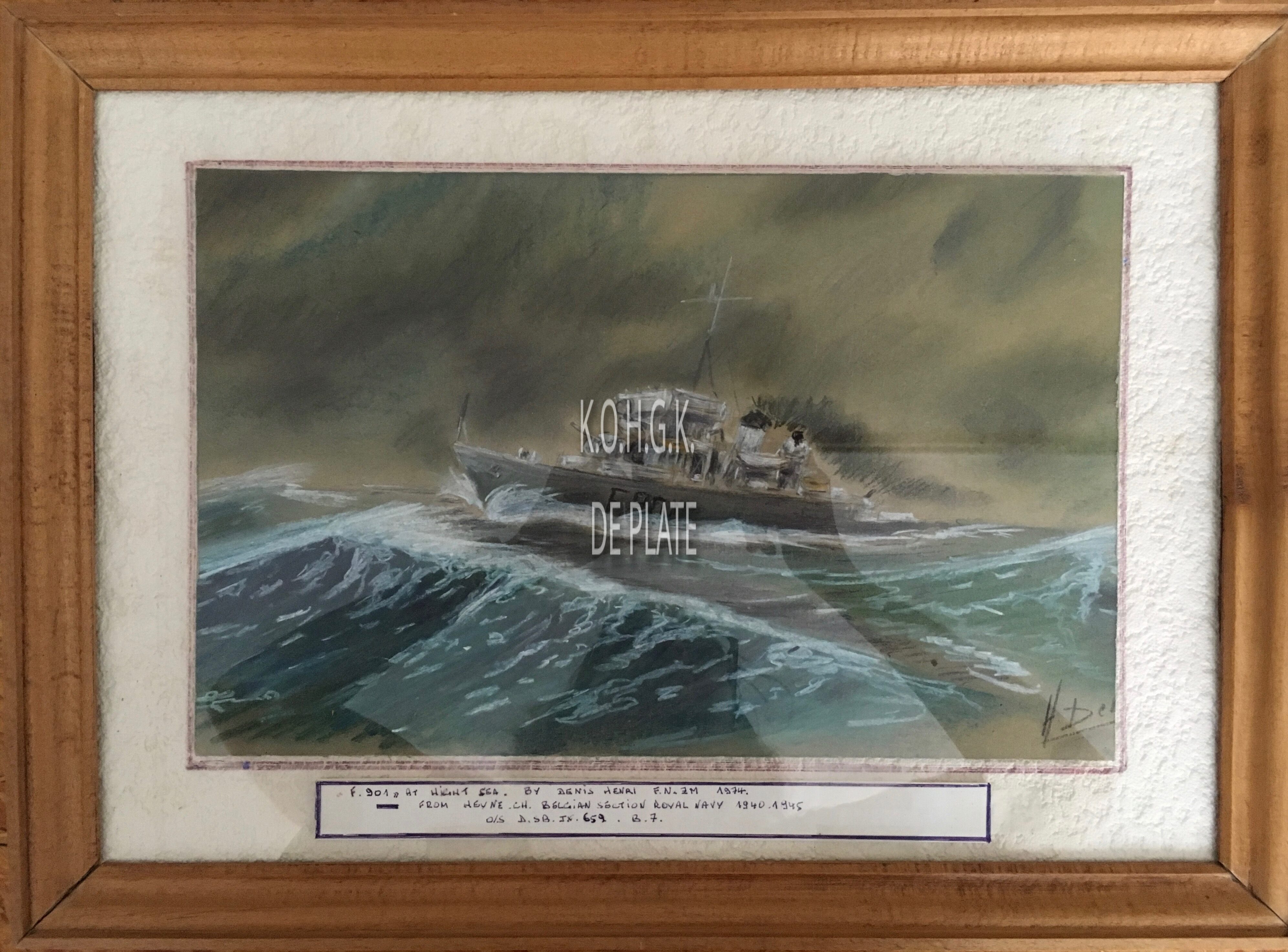 Onder het schilderij in het midden : F.901 AT HIGH SEASGesigeneerd rechtsonder : BY DENIS HENRI FN.ZM 1974 FROM HEYNE. CH BELGIAN SECTION ROYAL NAVY 1940-1945 0/S D.SB.JX.659. B.7.