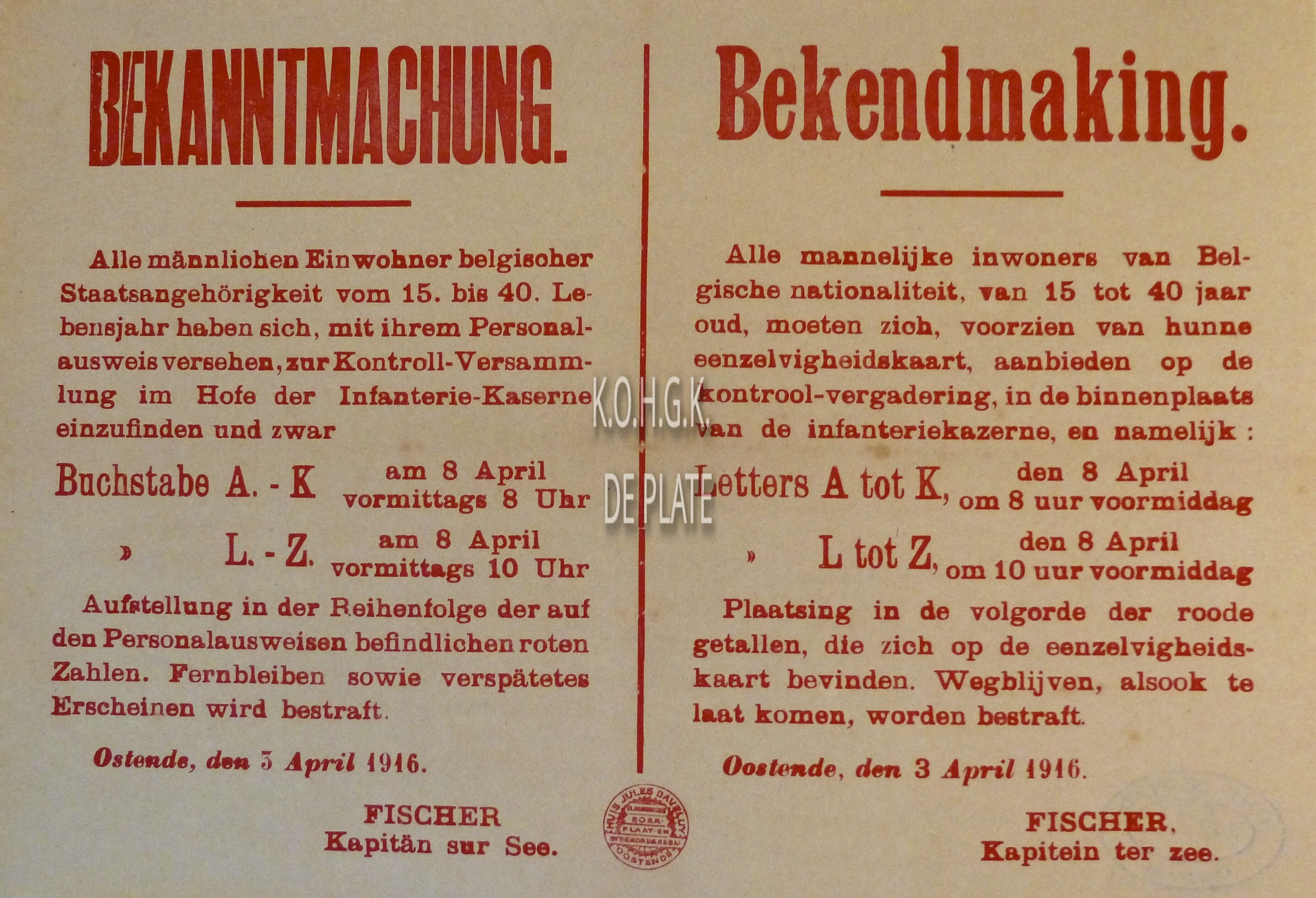 Formaat : 32 x 46 cm. Kennisgeving uitgaande van Kapitein ter Zee Fischer betreffende het aanbieden van de mannelijke inwoners in de kazerne voor controle