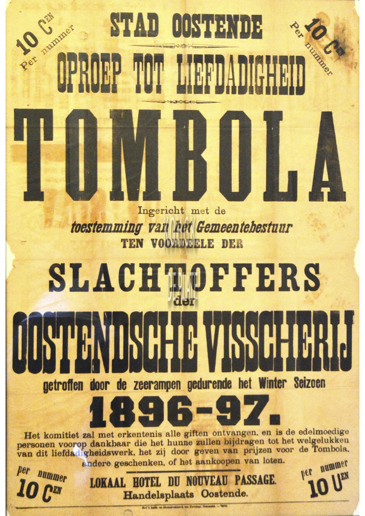 Formaat : 123 x 84 cm. In kader : 127 x 88 cm. - Stad Oostende. Oproep tot liefdadigheid. Tombola ingericht met de toestemming van het Gemeentebestuur ten voordeele der slachtoffers der Oostendsceh Visscherij getroffen door de zeerampen gedurende het Winter Seizoen 1897-97. Het komiteit zal met erkentenis alle giften ontvangen, en is de edelmoedige personen voorop dankbaar die het hunne zullen bijdragen tot het welgelukken van dit liefdadigheidswerk, het zij door geven van prijzen voor de Tombola, andere geschenken, of het aankoopen van loten. Lokaal Hotel du Nouveau Passage. Handelsplaats. per nummer 10 Cen of 10 Uen.