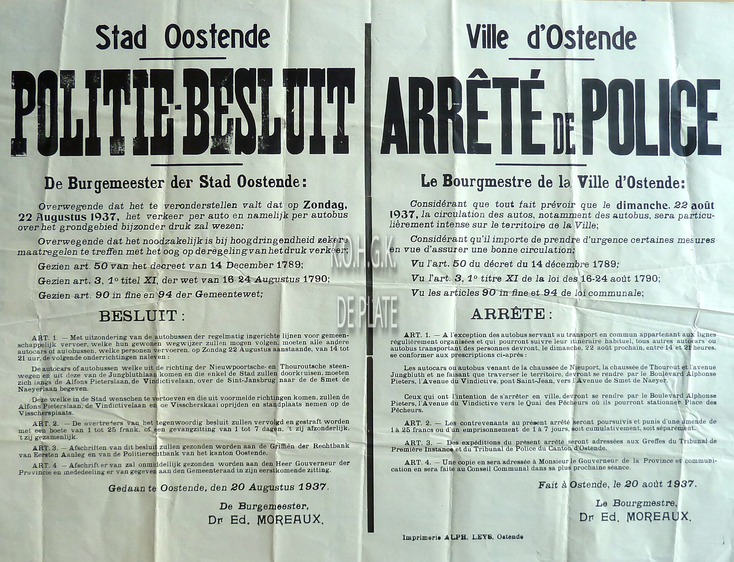 Formaat : 55 x 73 cm. - Tweetalig. - Verkeersregeling voor auto's en autocars voor een druk verkeer op zondag 23 augustus 1937. Getekend : de burgemeester, Dr. Ed. Moreaux