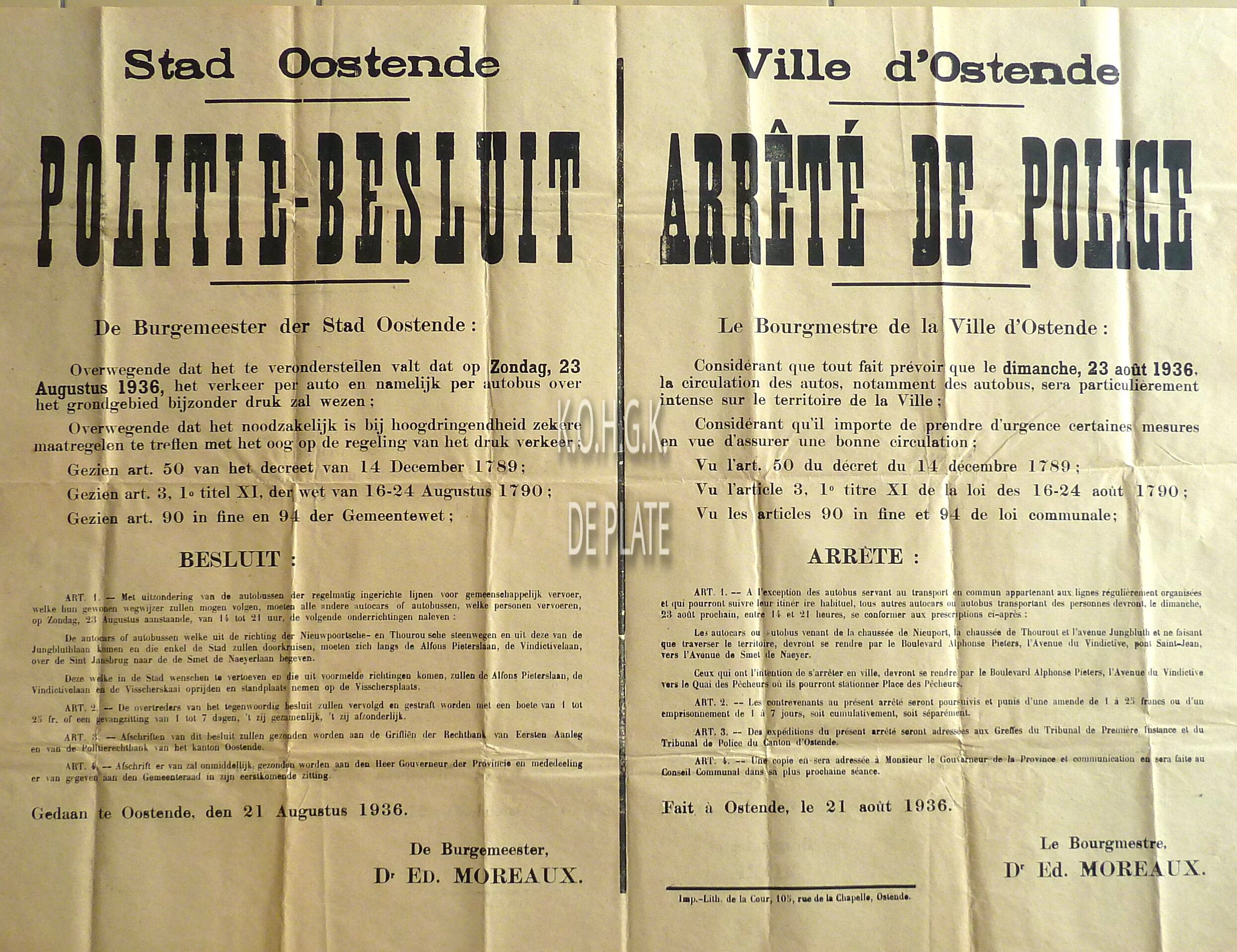 Formaat : 56 x 74 cm. - Tweetalig. - Verkeersregeling voor auto's en autocars naar aanleiding van een drukke zondag 23 augustus 1936. Getekend : de burgemeester, Dr. Ed. Moreaux