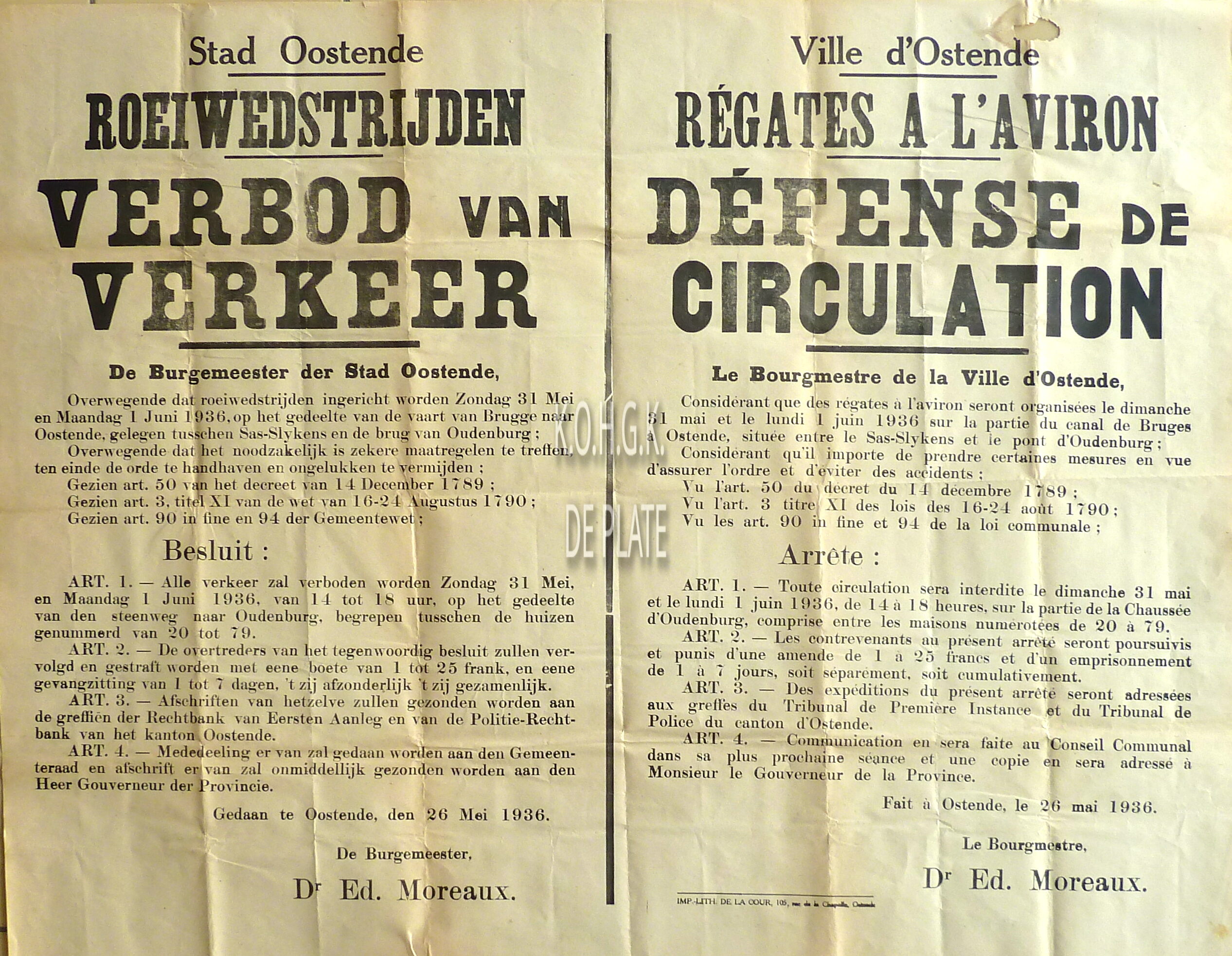 Formaat : 56 x 72 cm. - Tweetalig. - Verkeersreglement naar aanleiding van de roeiwedstrijden op het gedeelte van de vaart Brugge - Oostende, tussen Sas-Slijkens en de brug van Oudenburg, op 31 mei en 1 juni 1936. Getekend : de burgemeester, Dr. Ed. Moreaux