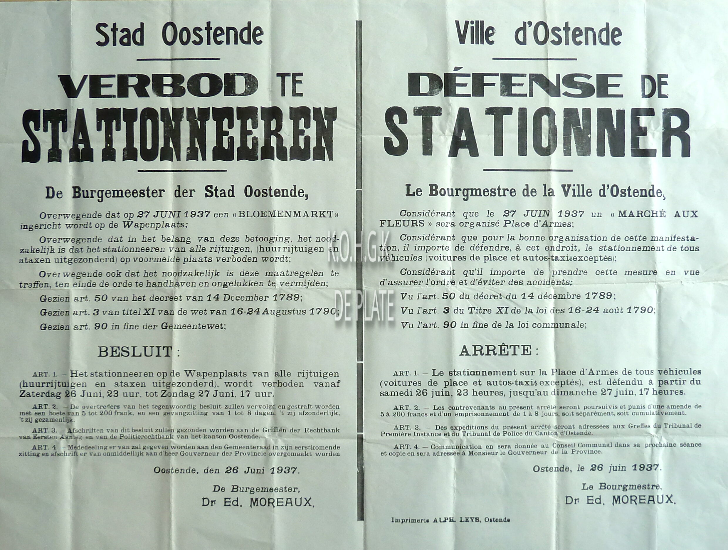 Formaat : 55 x 73 cm. - Tweetalig. - Verkeersregeling naar aanleiding van een "Bloemenmarkt" ingericht op het Wapenplein op 27 juni 1937. Getekend : de burgemeester, Dr. Ed. Moreaux