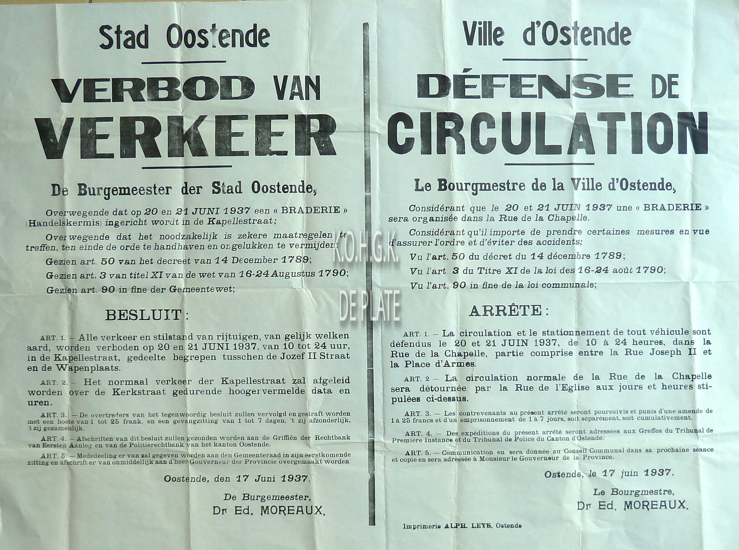 Formaat : 55 x 73 cm. - Tweetalig. - Verkeersregeling naar aanleiding van een "Braderie" ingericht in de Kapellestraat op 20 en 21 juni 1937. - Getekend : de burgemeester, Dr. Ed. Moreaux